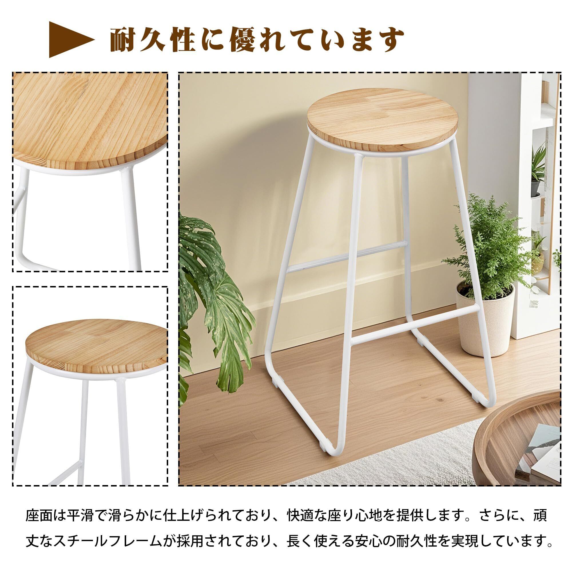 【耐久性&安定性】座面は高品質のマツ材で加工されており、脚部は耐久性のあるスチール製です。これにより、非常に安定したバースツールが実現し、変形や破損しにくく、長期間使用できます。ニス塗装仕上げで、カビに強く、長期間使用できます。脚裏には床傷防止マットが付いているため、滑り止め効果があり、床を傷つけにくいです。