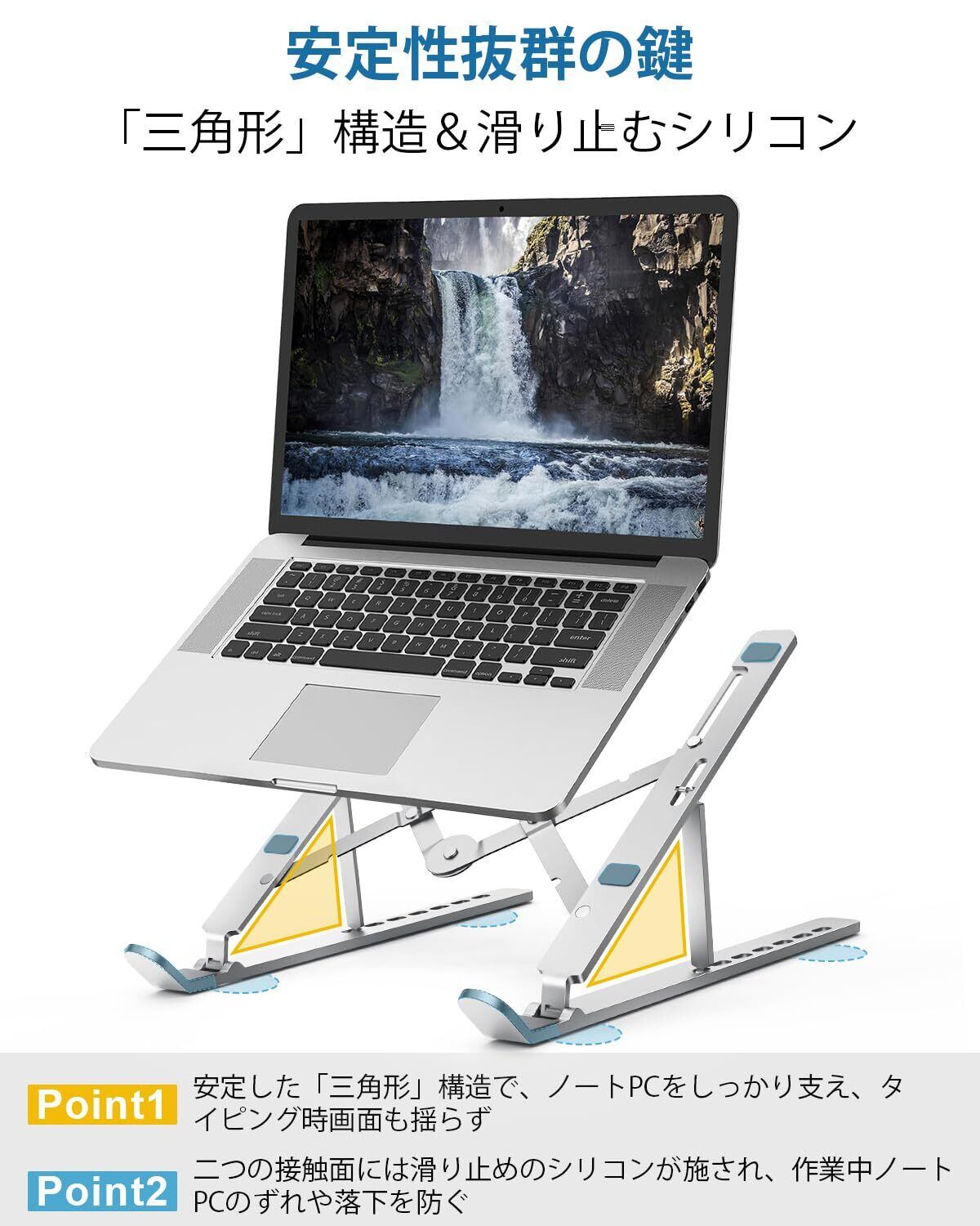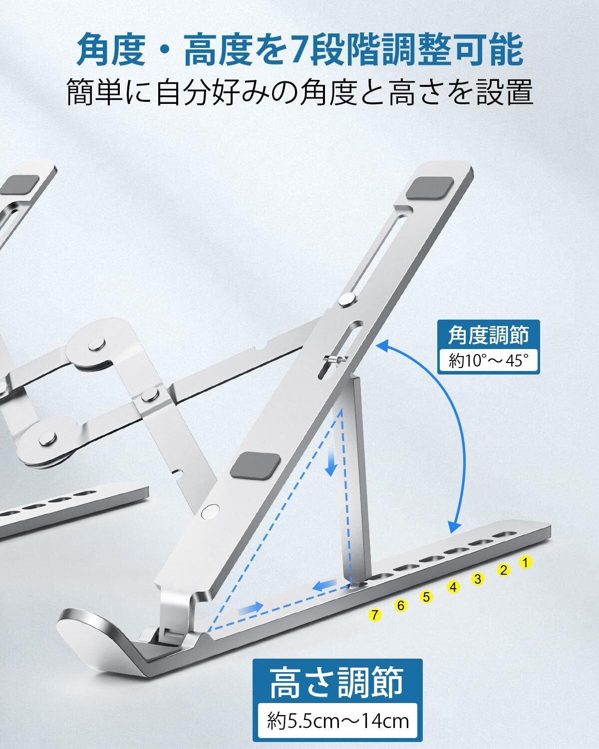 ノートパソコンスタンド 折り畳み式 ノートpc スタンド 安定 超軽量 7段階高さ角度調整可能 姿勢改善 腰痛 猫背 肩こり解消 卓上 アルミ合金製 滑り止め 持ち運びに便利 ラップトップ/タブレット/液タブ/Macbook 17インチまで対応 シルバー