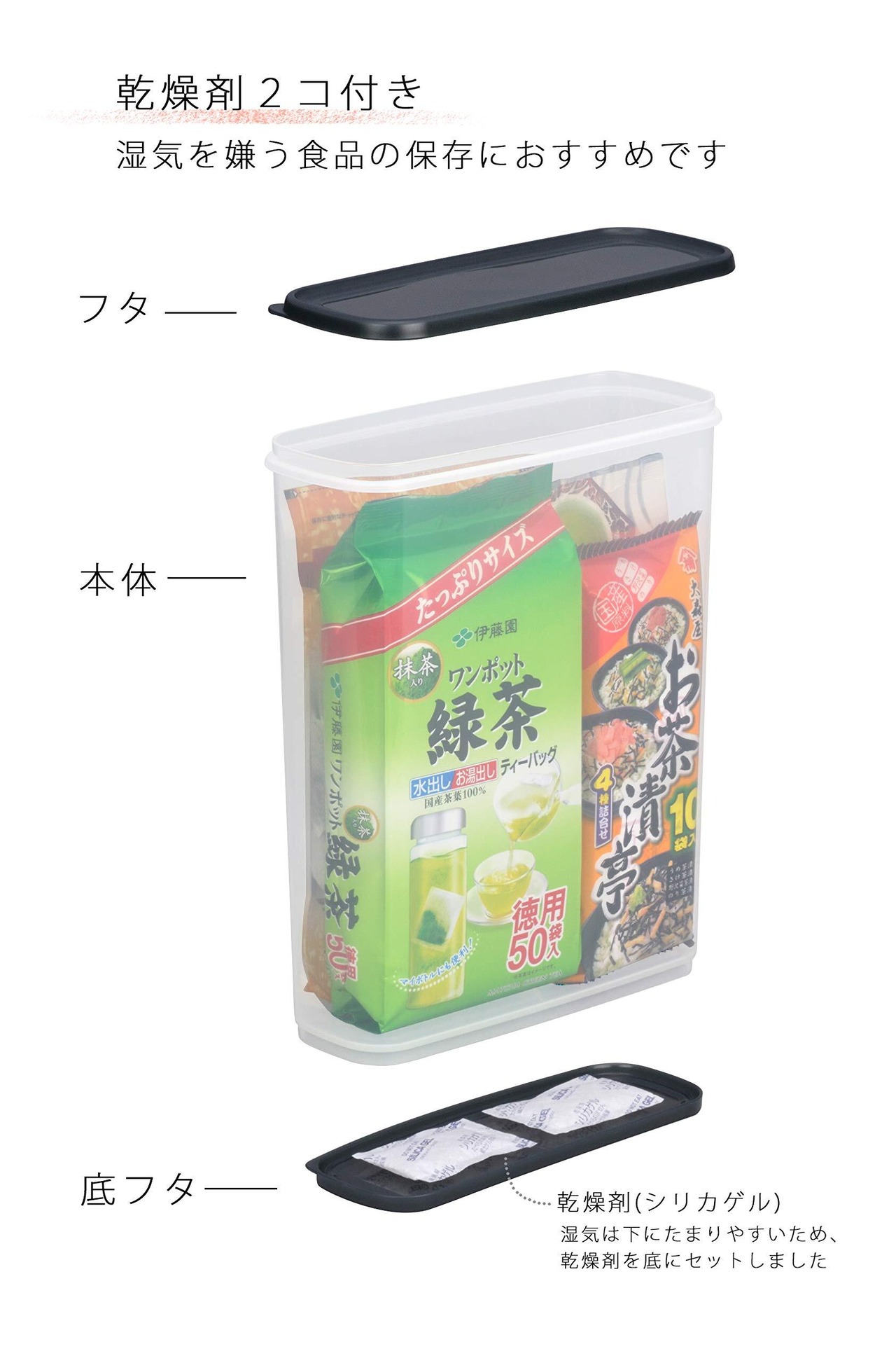 ●湿気を嫌う食品の保存・収納に。●スリムタイプだから中身が見やすく、持ちやすい。●出し入れもスムーズで見た目もスッキリ。●乾燥剤は本体と底ブタの間に入っていますので、食品をいれたまま乾燥剤の取り出し、取付けができます。