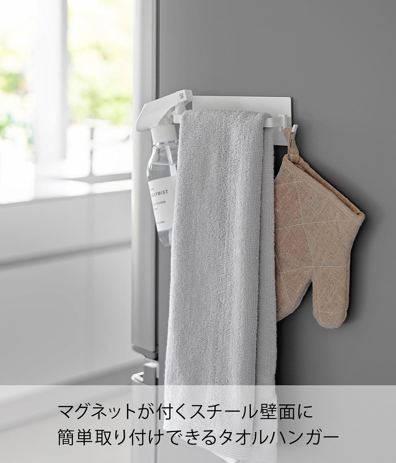 マグネットがつくスチール壁面に簡単に取り付けできるタオルハンガー。