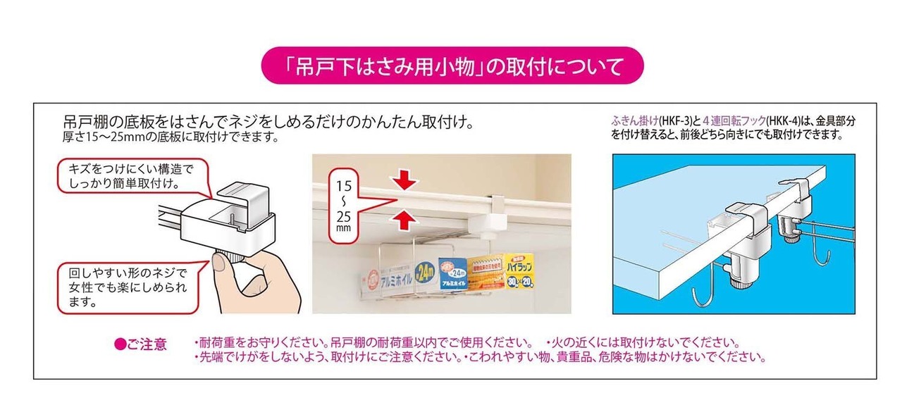 ●吊戸棚の底板をはさんでネジをしめるだけのかんたん取付け、厚さ15~25mmの底板に取付けできる