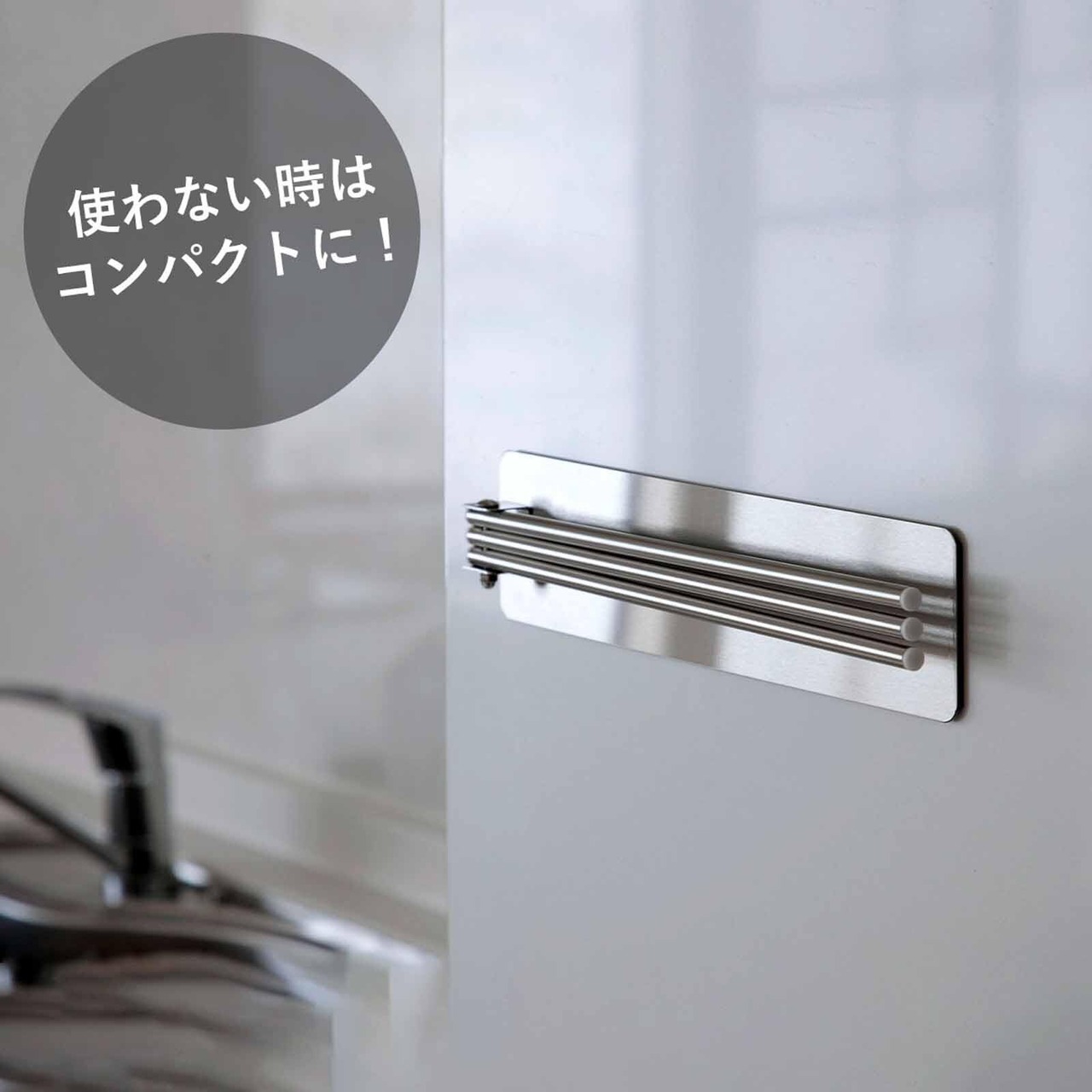 冷蔵庫にピタッ。大判マグネット固定式のフキン掛け。冷蔵庫の放熱でフキンが乾きやすい。サビにくいステンレス製※バー角度は30度以上広げると落下しやすくなります