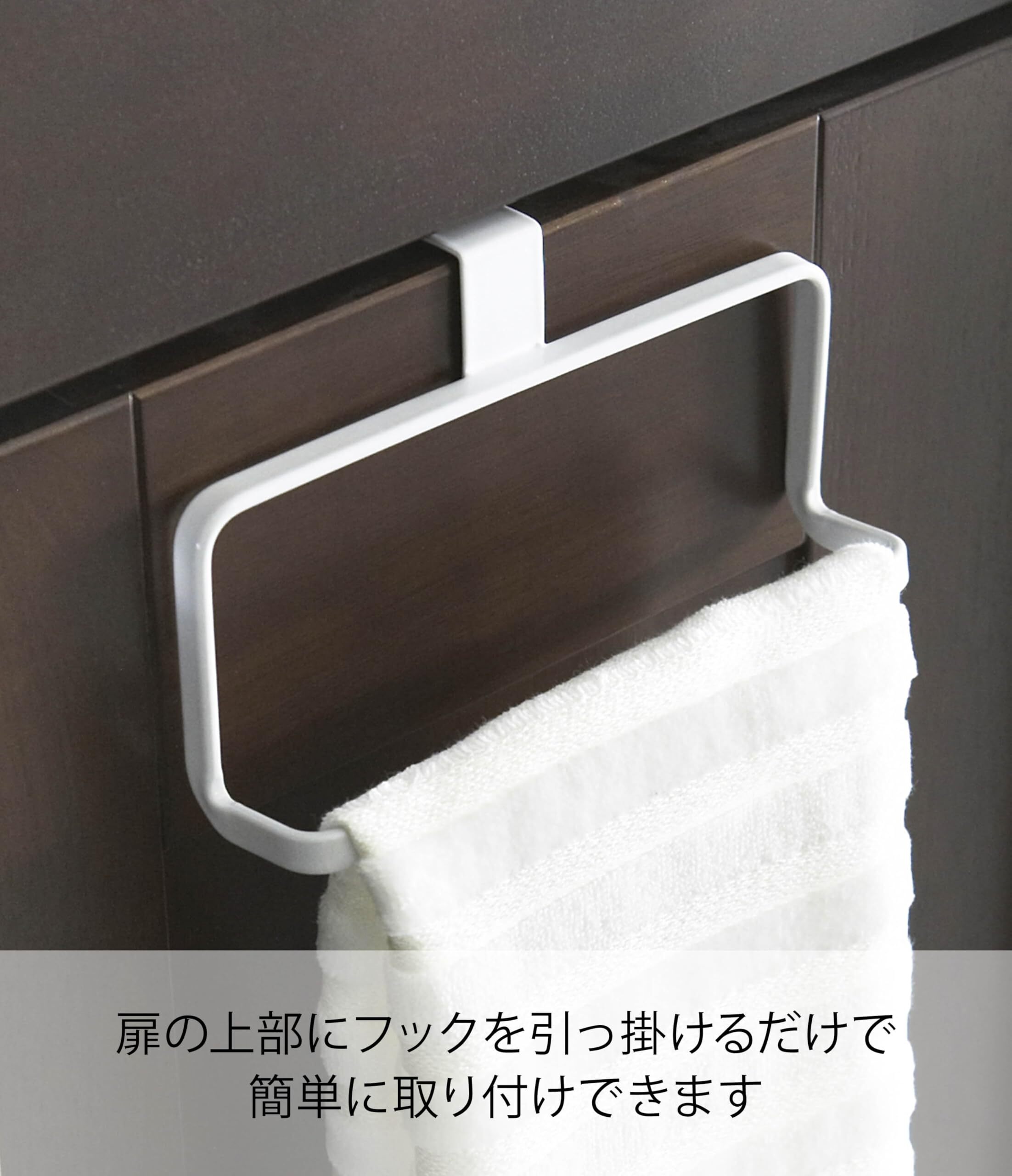 シンク下の扉に引っ掛けるだけの取り付け簡単タオルハンガー。洗面所の扉にも使えます。キッチン周りをスタイリッシュに演出するシンプルなデザイン。