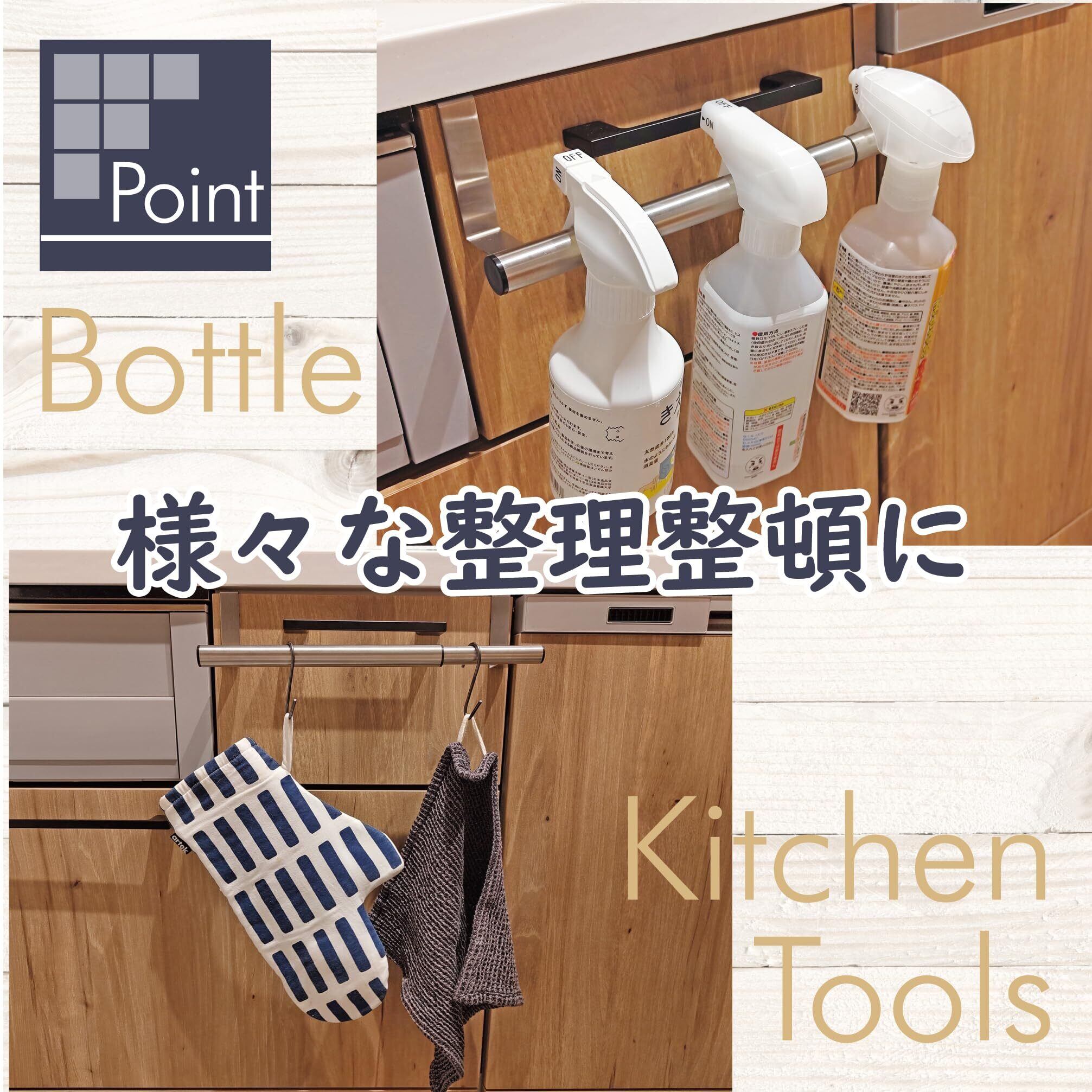 【工具不要で簡単に取り付け可能!】引き出しや扉にかけるだけの簡単設置。扉と接するフック部分には厚さ約2mmのクッションが付属、扉の傷つきを防ぎます。【掃除道具やスプレーを浮かせて収納】スプレーのハンドル部分をかけて整理したり、S字フック(別売り)を使用して道具をしまったり。使いやすい箇所に収納を増やすことができます。※バー直径;約16~19mm。フック内径20mm以上のものがご使用いただけます。