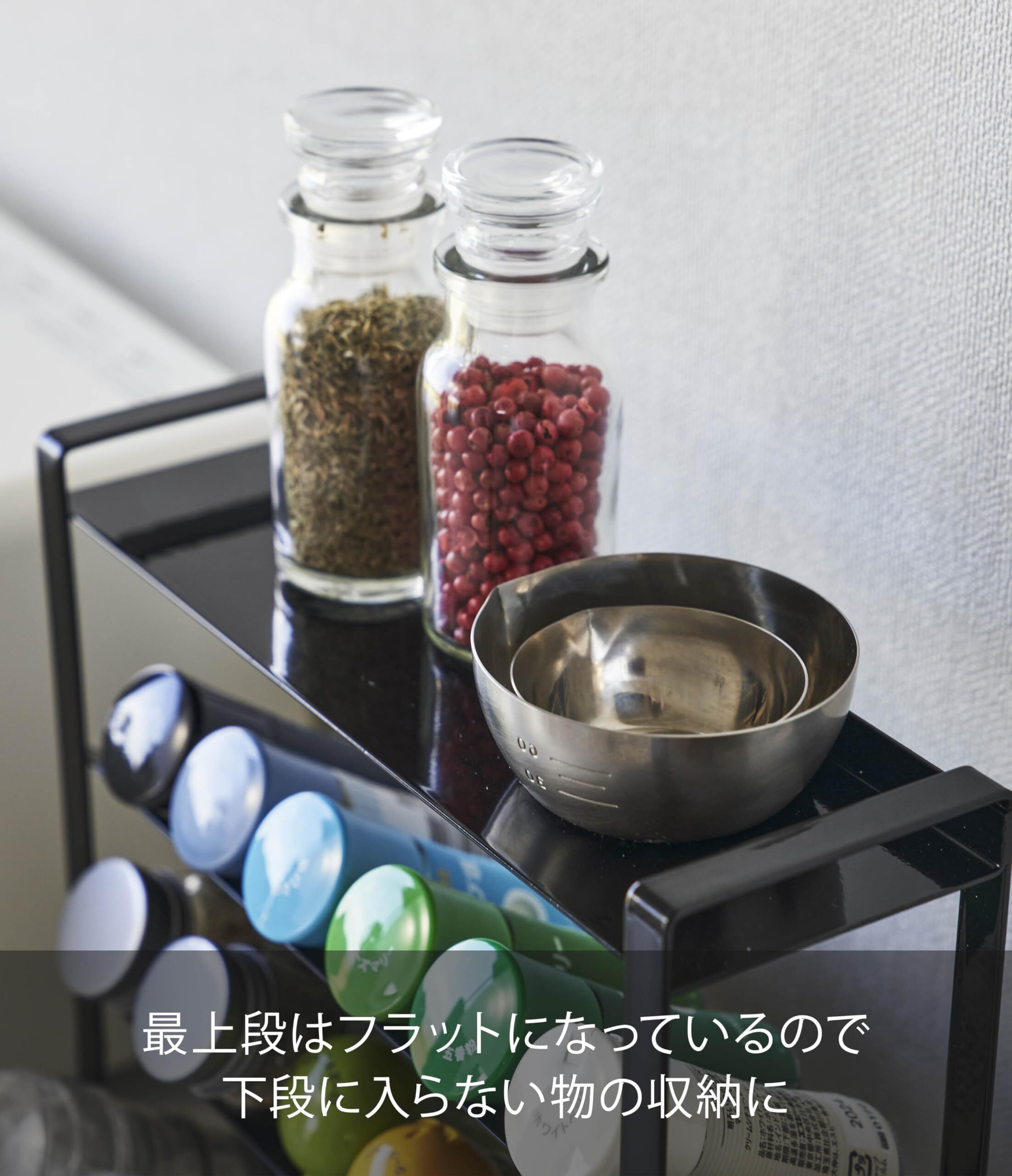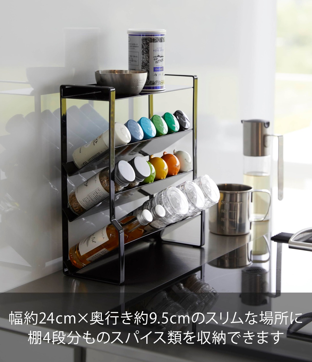 種類が増えて散らかりがちなスパイスをスリムに収納!約幅24×奥行き9.5cmのスリムなスペースに、棚4段分のスパイス類が収納できる大容量のラック。