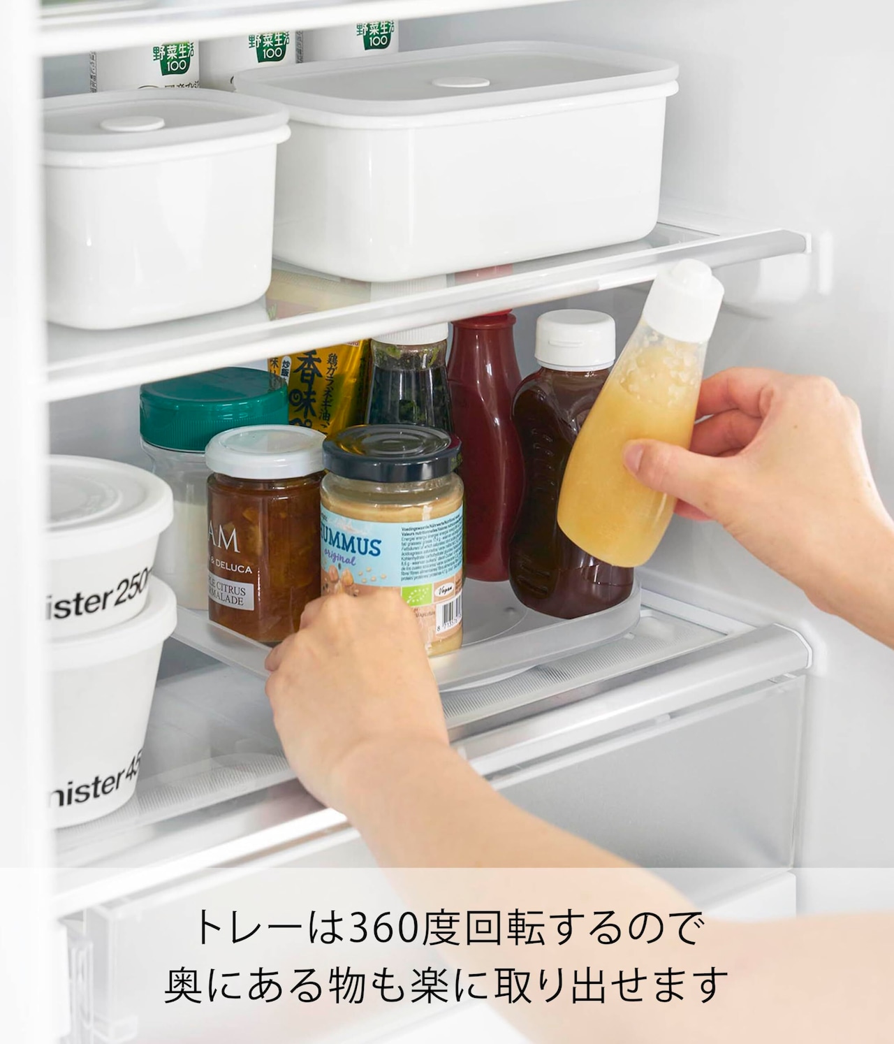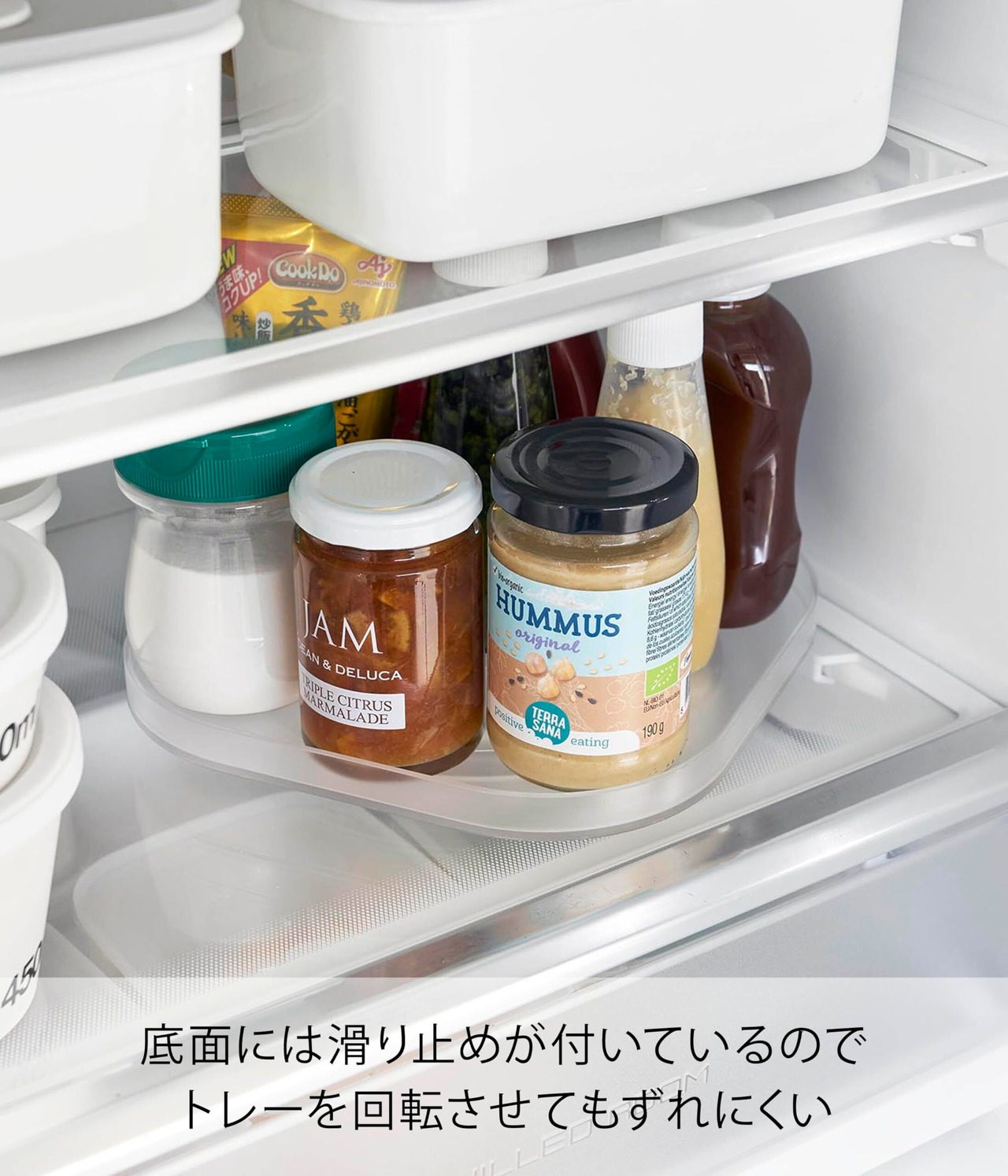 奥にある物も回転させることで楽に取り出すことができ、底面には滑り止めがついているのでトレーを回転させてもずれにくく安心です。