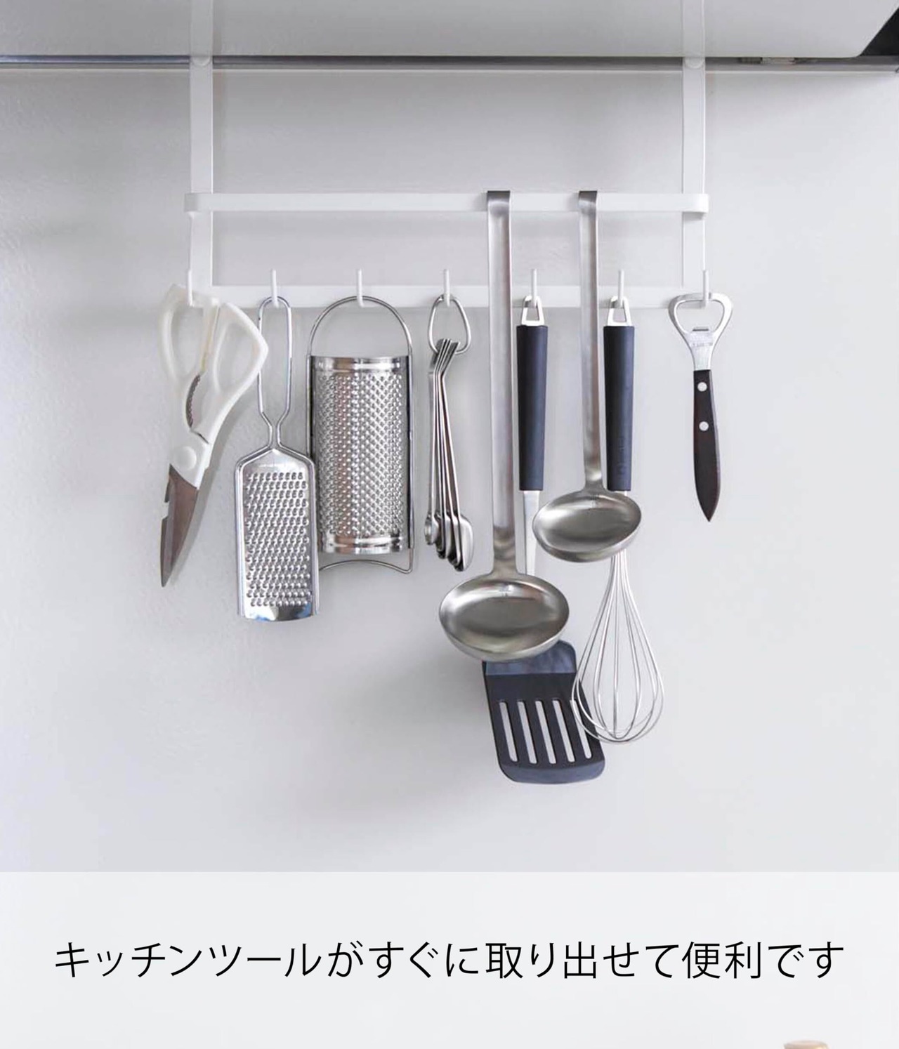 レンジフードに引っ掛けるだけでキッチンツールの収納スペースに