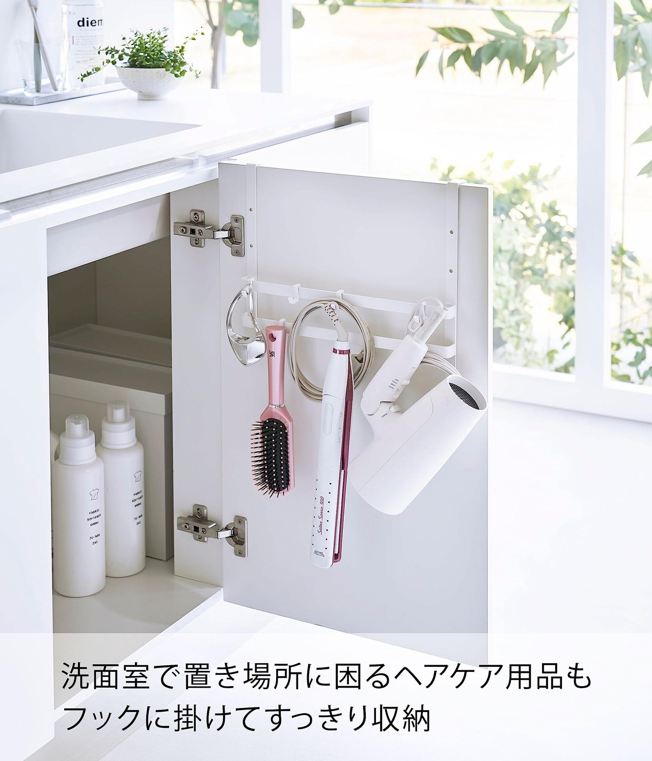 洗面所で置き場所に困るヘアケア用品もフックに掛けて収納。