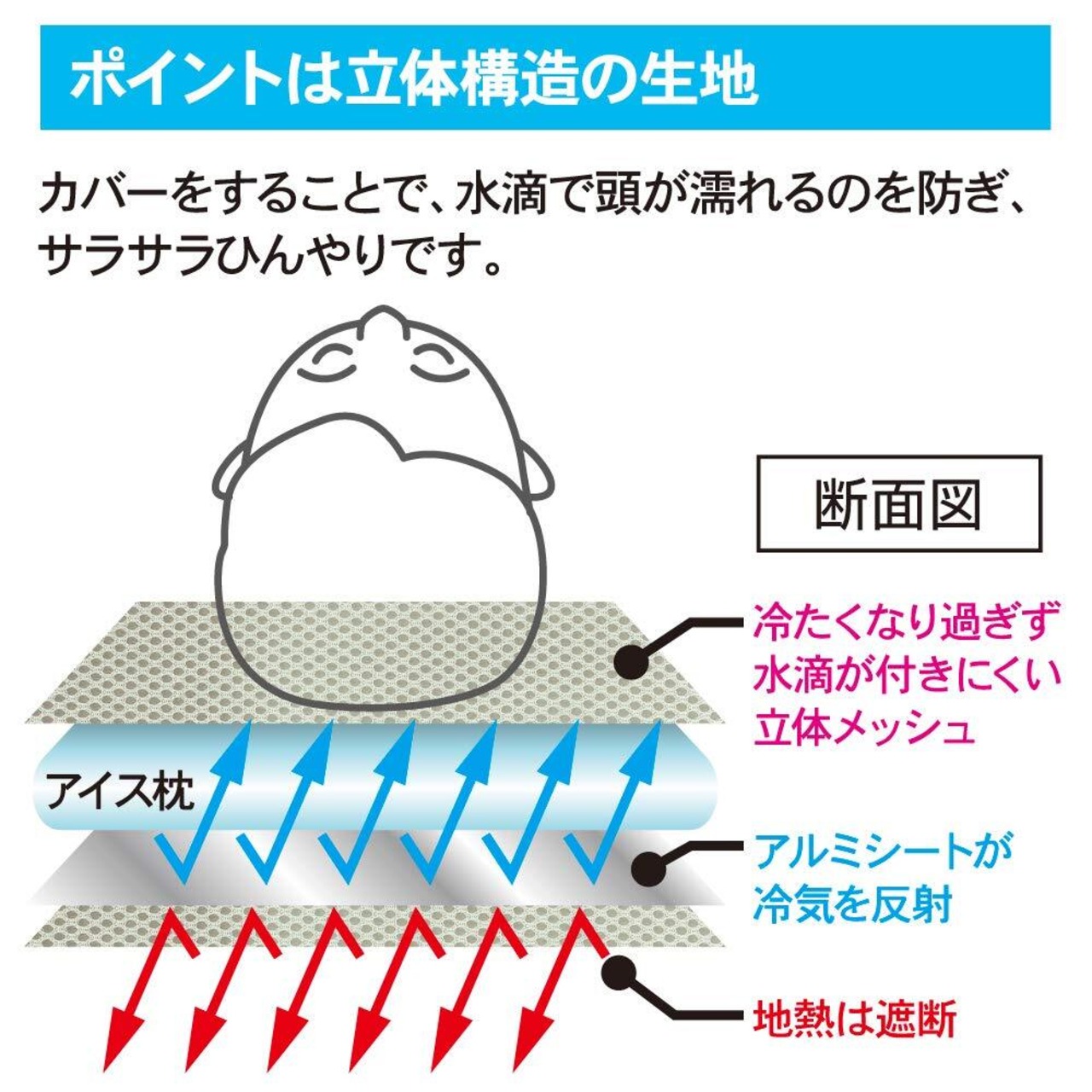 ポイントは立体構造の生地。カバーをすることで、水滴で頭が濡れるのを防ぎ、サラサラひんやり。