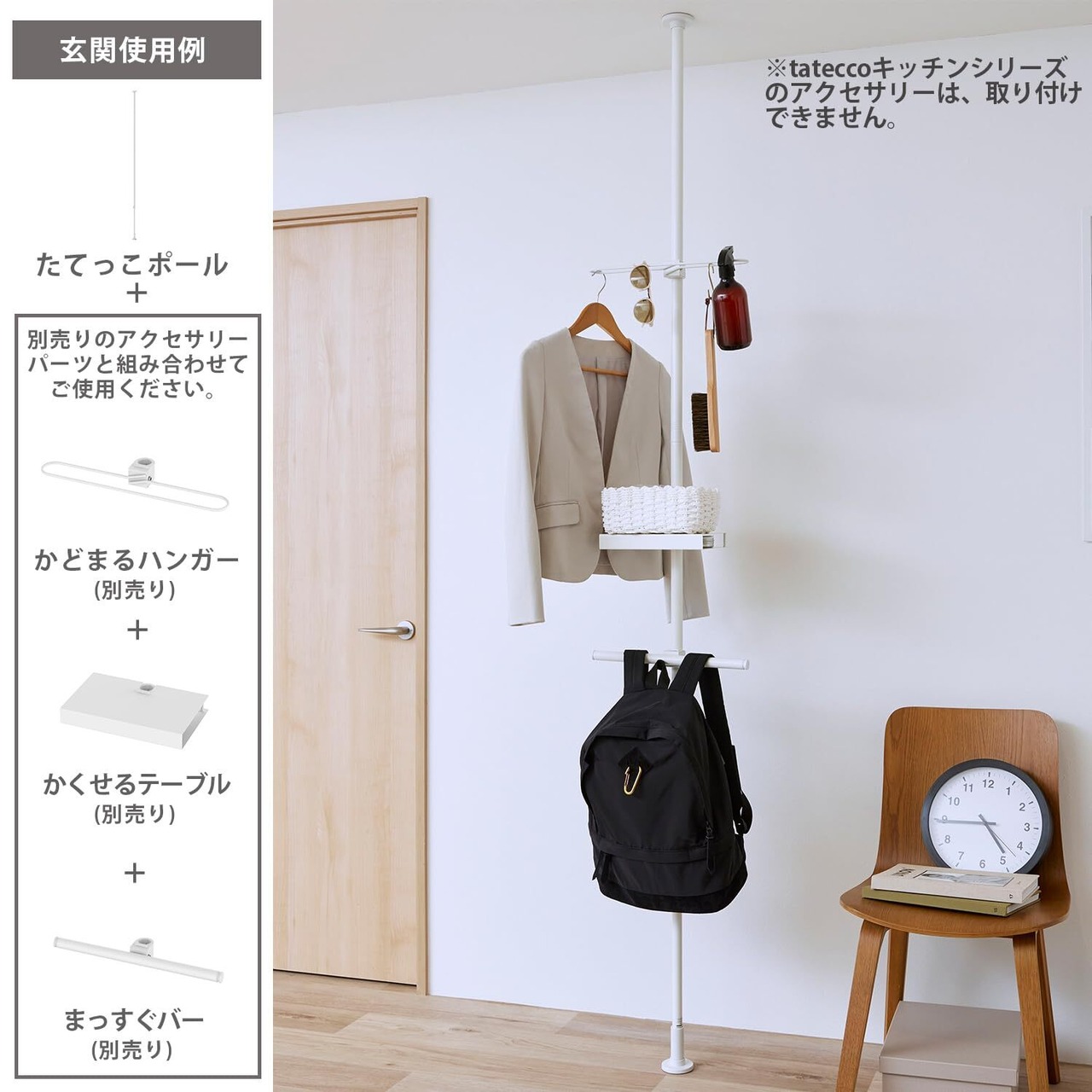 縦つっぱり棒とアクセサリーを組み合わせて、ひとりひとりに合った収納がつくれる。5つのアクセサリーから好きな組み合わせをチョイス。「掛ける、置く、飾る」がたった1本で叶う。