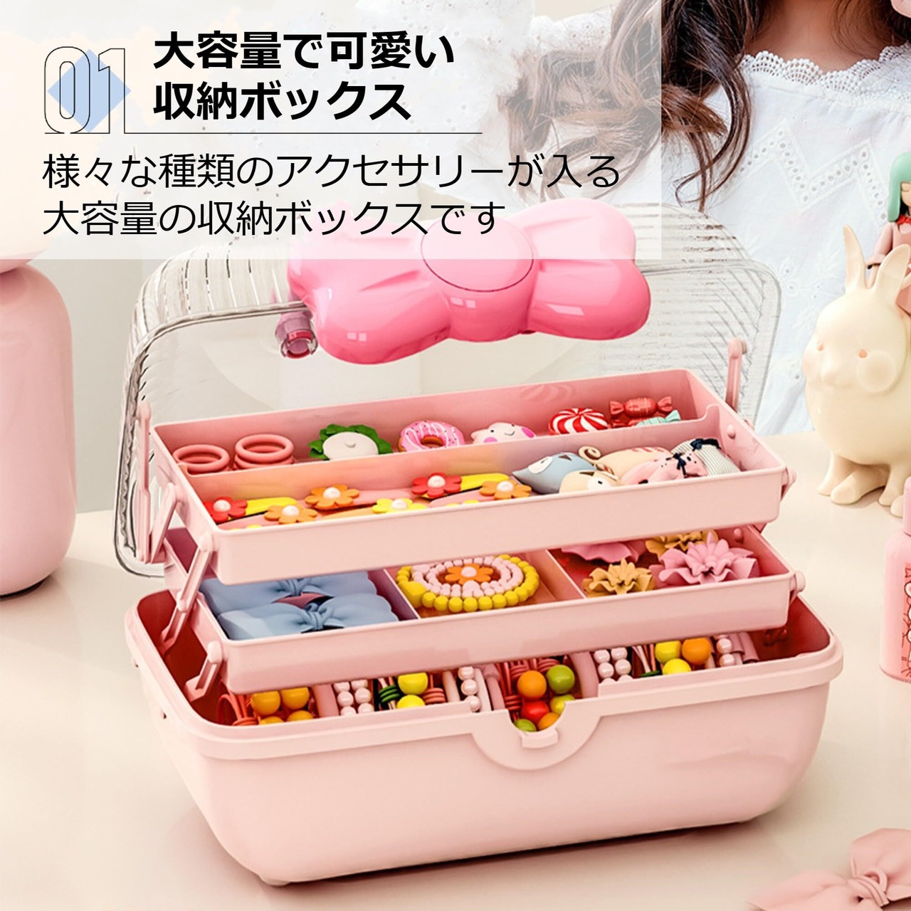 【大容量で可愛い収納ボックス】様々な種類のアクセサリーが入る大容量の収納ボックスです。引き出しを整理する必要がなく、ヘアアクセサリーが絡まる心配もありません。