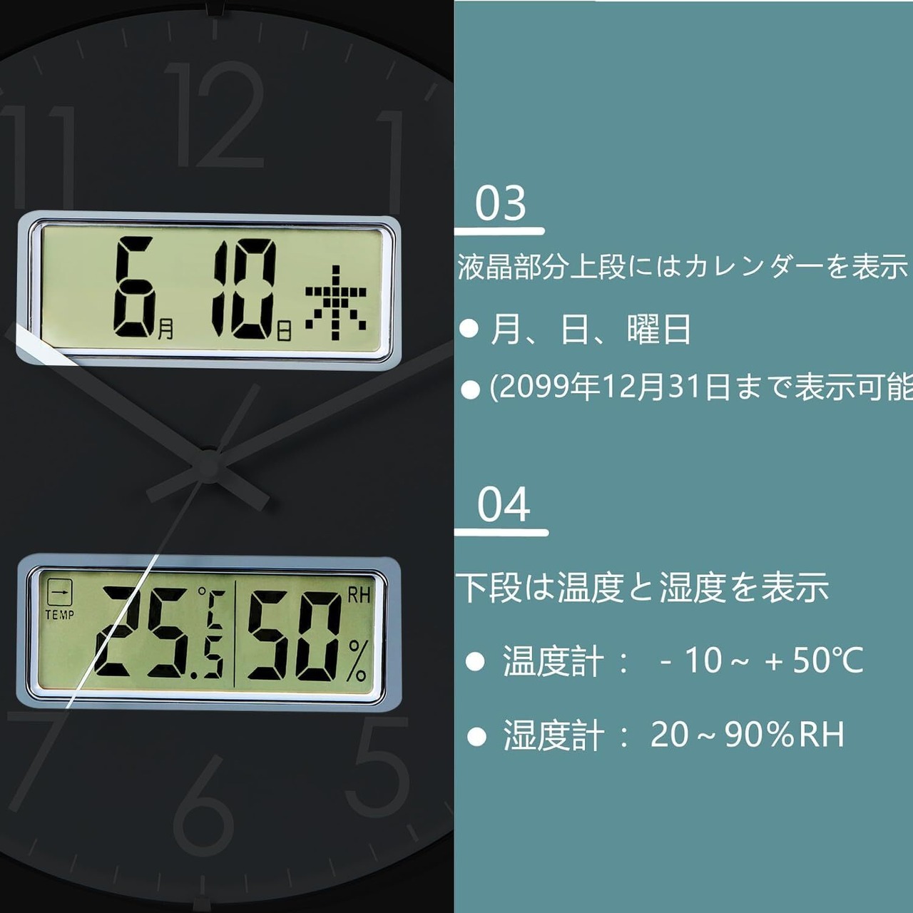 機能:電波受信機能(自動受信、手動受信)、ステップ秒針、夜間秒針停止機能(午後10時~午前6時)、カレンダー表示、温度表示、湿度表示ル