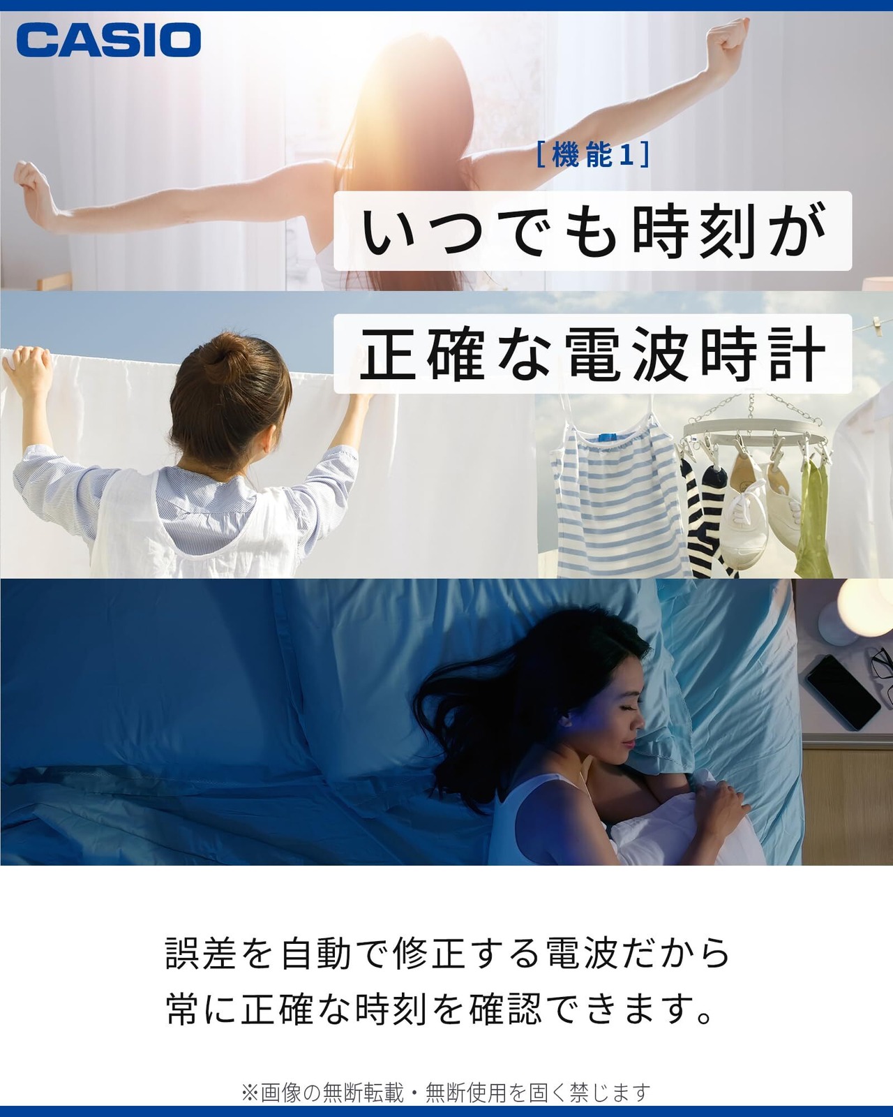 機能:電波受信機能(自動受信/手動受信、自動選局機能付き)、電波受信OFF機能、電波受信ランプ(電波受信結果をランプの点灯でお知らせ)、秒針停止機能(明暗判定センサーにより、暗くなると秒針が自動的に停止し、明るくなると自動的に動き出します)
