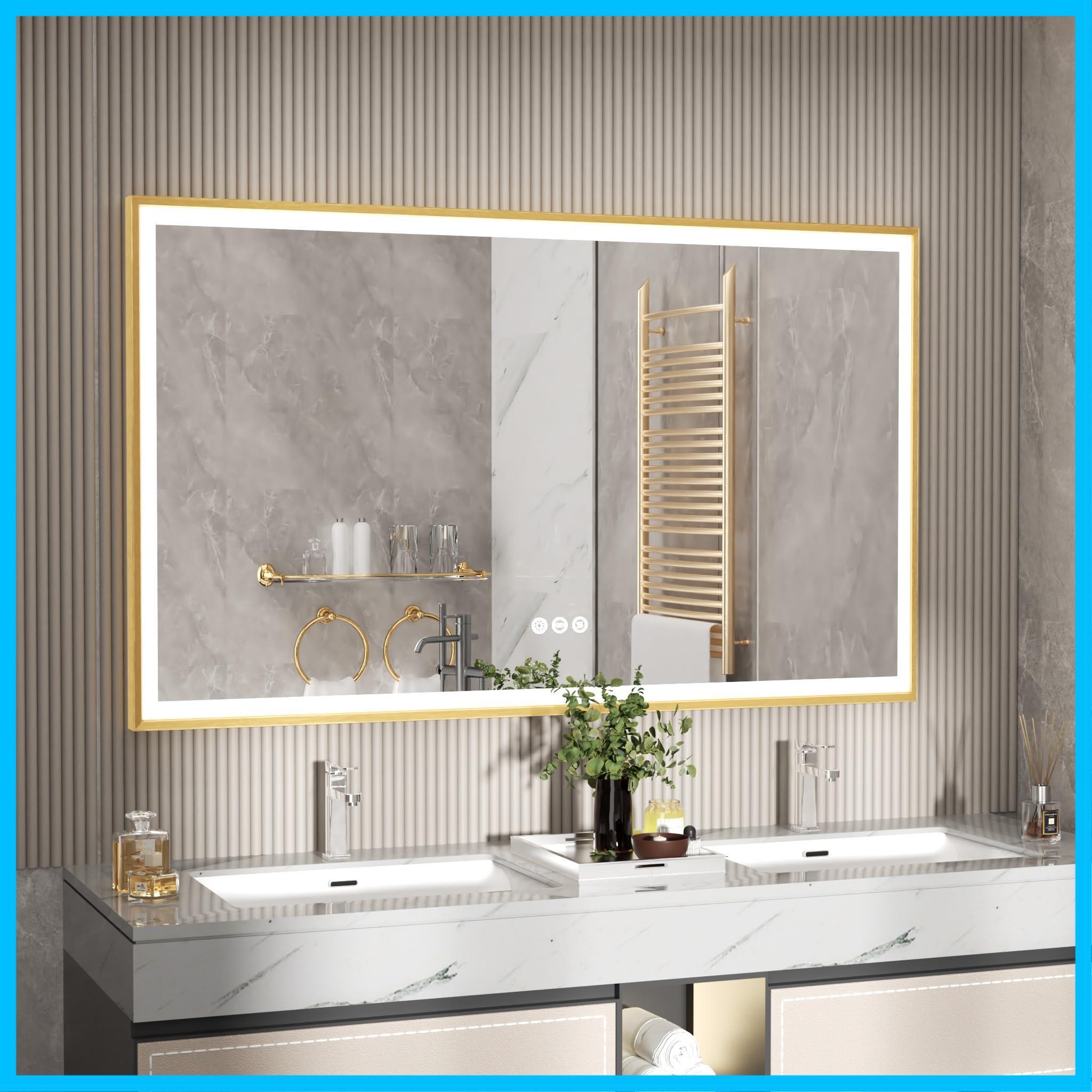Susire 洗面鏡 壁掛け 全身鏡 100cm×60cm 大きい ledライト付き ゴールドフレーム 照明付き 姿見 玄関 洗面所の鏡 おしゃれ 長方形 横長 美容室 女優ミラー モダン 高級 飛散防止
