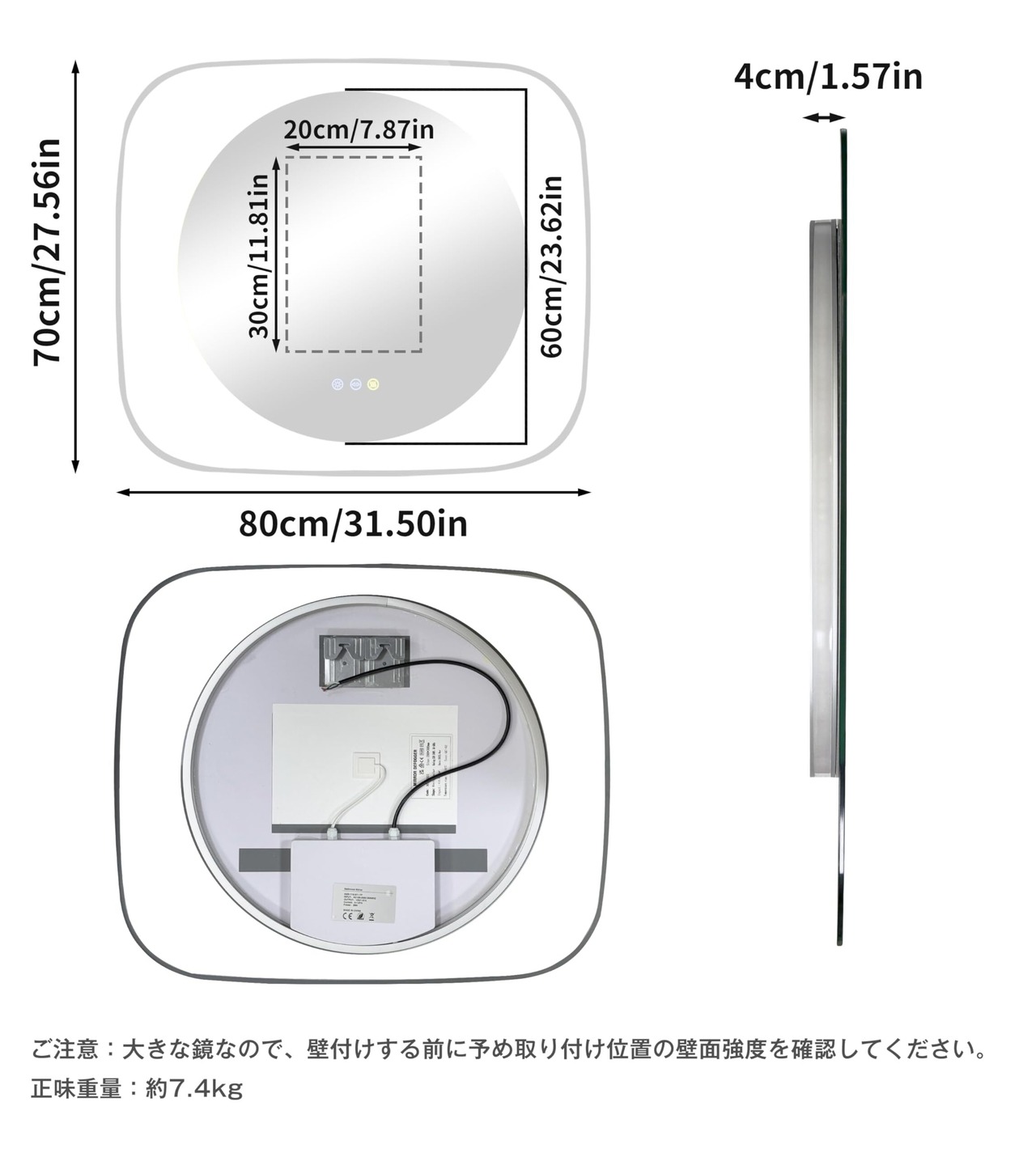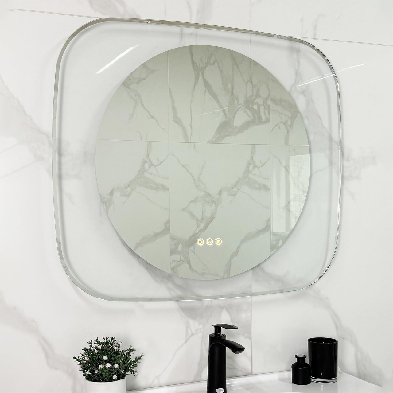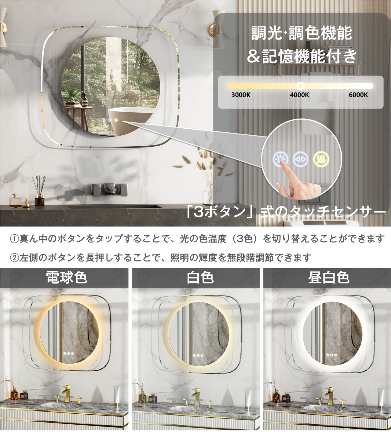 【オリジナルな3ボタン式のタッチセンサー】鏡面スイッチは従来の「2ボタン」から「3ボタン」に改良されたので、防曇機能も照明も1回だけタップすることでON/OFFでき、何度もタップする必要がないので、操作しやすくなります