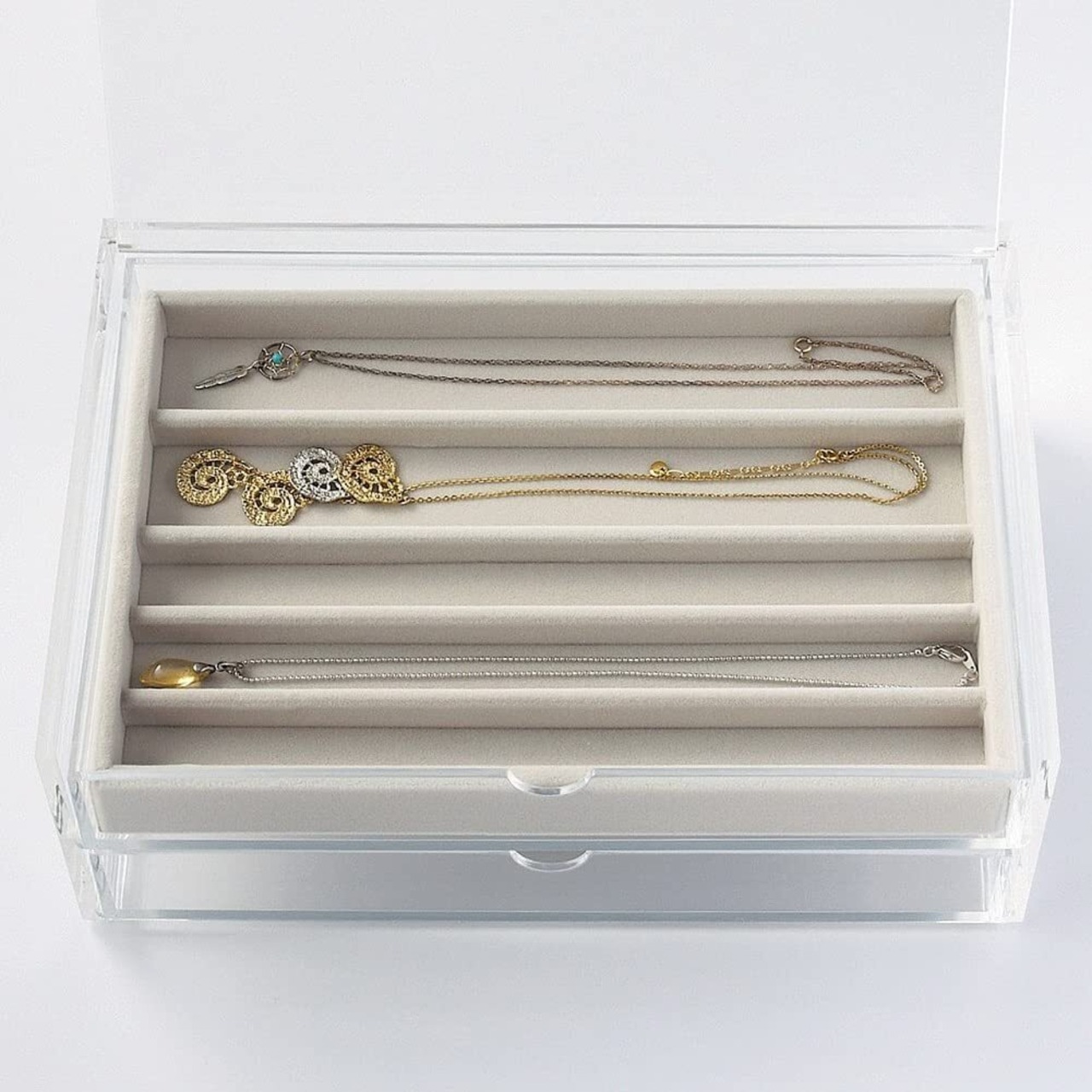 そのまま単体で使っても、上下積み重ねても、別売りの重なるアクリルケースに入る、アクセサリーや腕時計の収納に適したケースです。