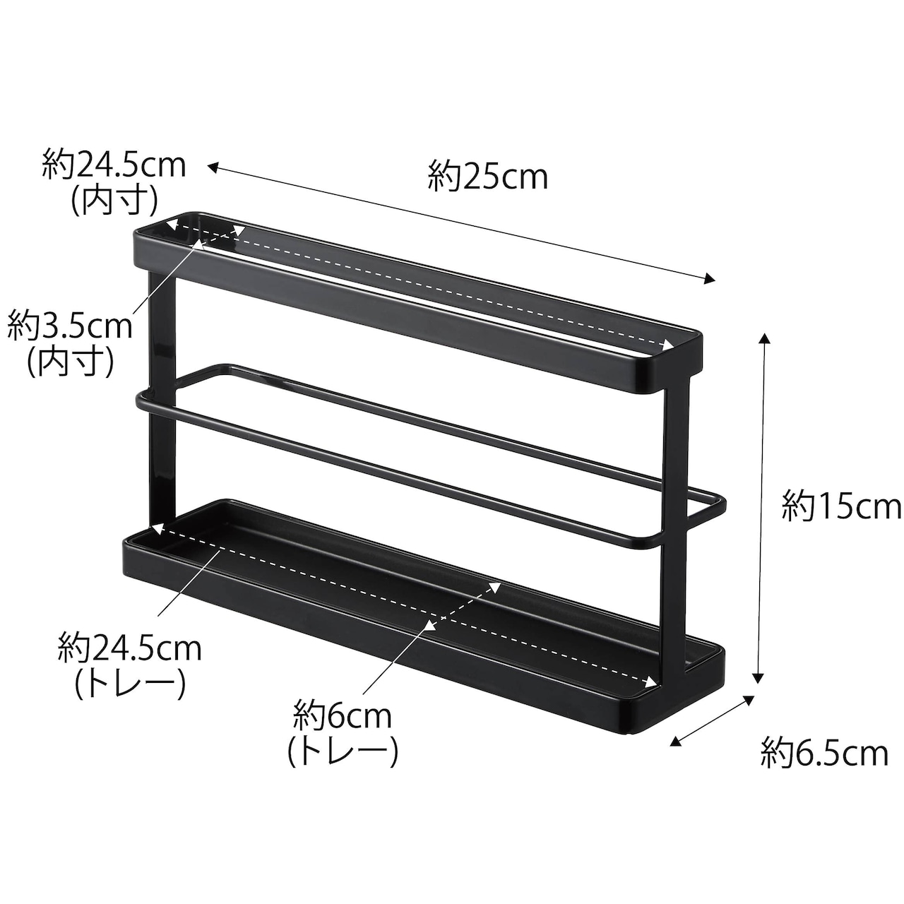 商品サイズ:本体:約W25×D6.5×H15cm(フィルムフック含まず) トレー:約W24.5×D6×H1.3cm フィルムフック接着面:約W7×H7cm(1つあたり) ・内寸:ホルダー部:約W24.5×D3.5cm