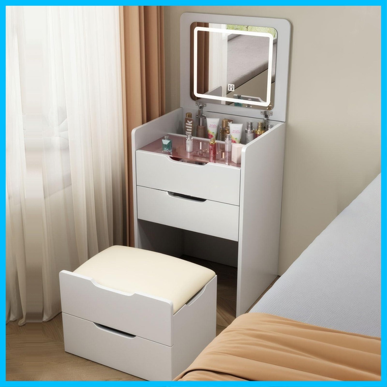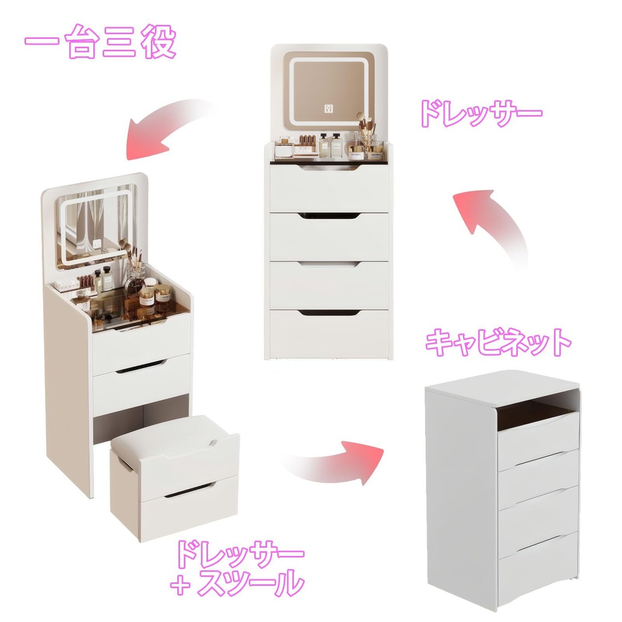 ドレッサー コンパクト テーブル LEDライト付き 大容量収納力 優ミラー 鏡台 化粧台 優ミラー 鏡台 化粧台 小型 電源式 スマート 3 色光(自然光/暖光/冷光)防臭環境保護材 寝室用 化粧卓 デスク兼用 丸み角 安定卓脚 付属化粧スツール 高密度スポンジクッション(48×40×120cm ホワイト)