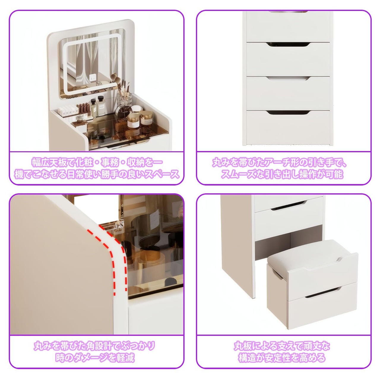 ・スマートコンパクト設計:48cm 幅で小スペースにも適し、丸み角・安定卓脚で安全性向上・付属化粧スツール:高密度スポンジクッションで長時間座っても快適