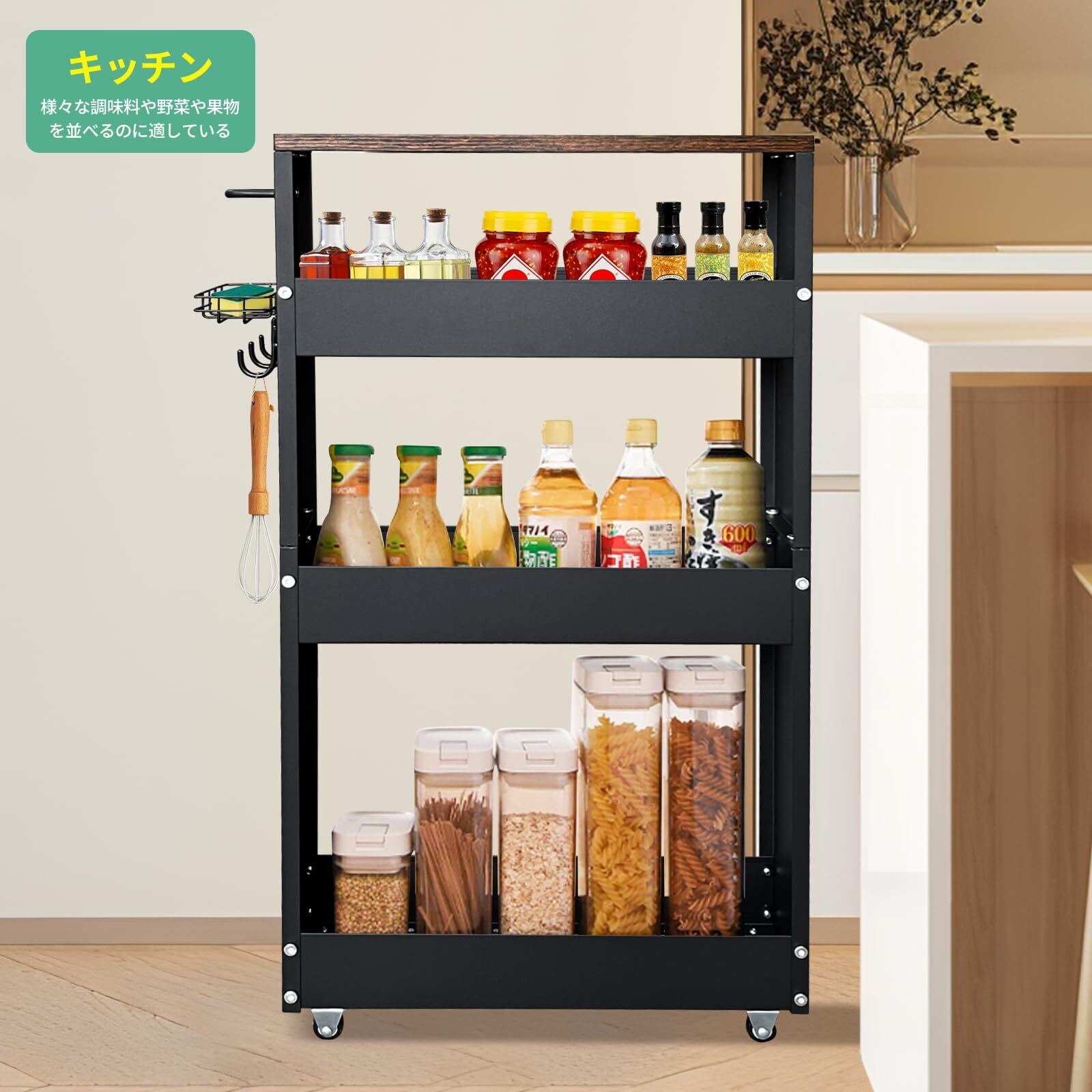 Roweida キッチンワゴン隙間収納スリム13 cm 移動式隙間ラック 冷蔵庫横 洗面所 ラック 隙間棚 4段 洗濯機横 スリムワゴン 細い棚 調味料棚 メタルフレーム木製天板 ブラック