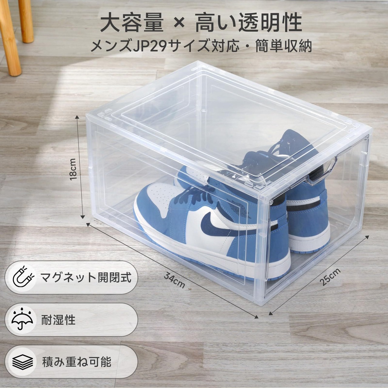 【四面クリアで中が見える】四面透明のクリアケースなので、収納した靴が一目で分かり、探す手間を省けます。お気に入りのスニーカーコレクションやLEGOなどの展示にも最適です。防塵性・防水性にも優れており、収納したものをホコリや湿気から守ります。湿気の多い場所でも活躍し、カメラや電子機器の保管にもおすすめ。