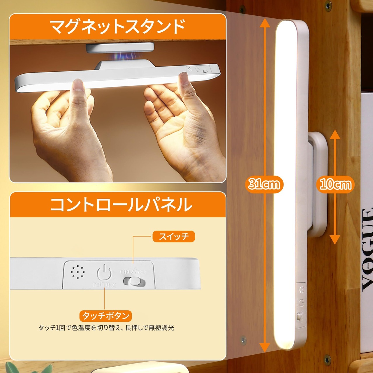 デスクライト LEDライト 目に優しい マグネット付き 寝室 ベット 学習机 戸棚 クローゼット 壁掛け 車内 3種類色温 角度調節可能 読書灯 USB充電式 (ホワイト)