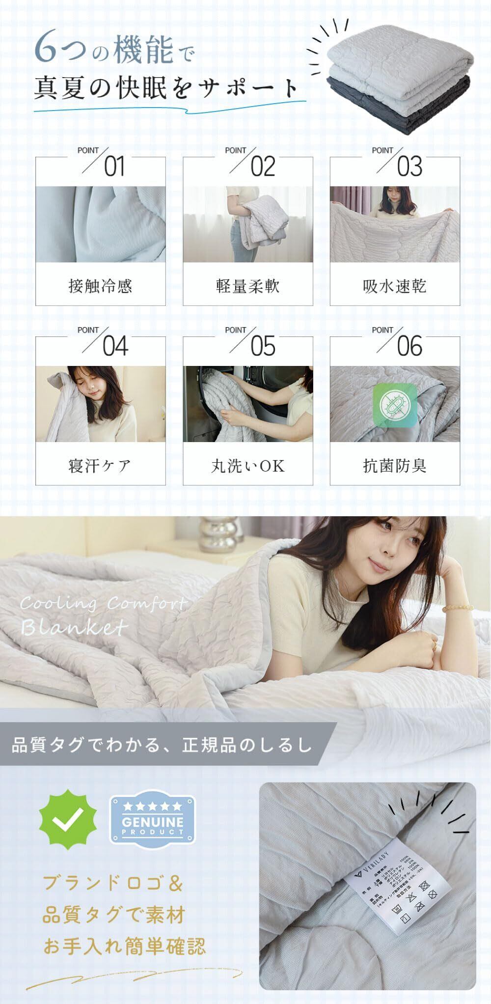 【究極のひんやり感、革命的な掛け布団の誕生!】 多くのお客様のご要望にお応えして、暑い夏の夜も快適に過ごせる、持続冷感設計の涼感ブランケットが登場!VERILADY冷感掛け布団は、Q-MAX値0.42の高性能冷感素材を採用し、肌に触れた瞬間から体温を素早く吸収し、ひんやり感が長時間持続。くしゅくしゅ加工により通気性がアップし、熱のこもりを防いで快適な睡眠環境を実現します。エアコンや扇風機との併用でさらに冷感アップ。エアコンの温度設定を抑えることで電気代の節約にも。軽やかでサラッとした肌触りが心地よく、蒸し暑い夏の夜でも快適にお休みいただけます。