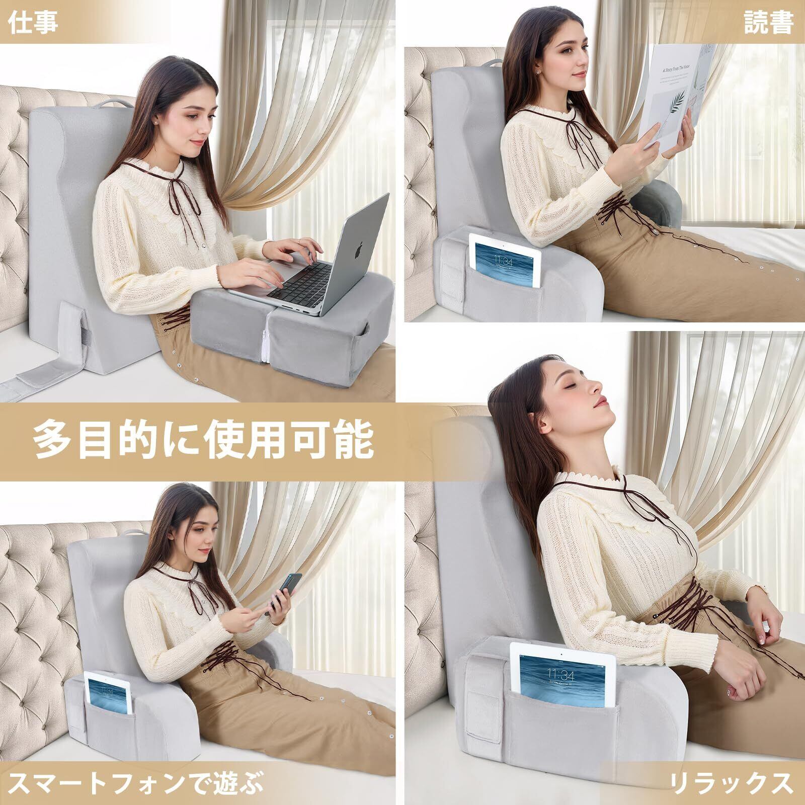 【多機能読書クッション】ベッド 背もたれ クッションは、壁、ベッド、ソファにもたれて、本を読んだっり、テレビを見たりするときに使用するのに適しています、男女兼用のデザインでさまざまな場面で活躍します。うつ伏せになってスマホを見て丁度良い角度です。 疲労を大幅に軽減し、快適性を向上させます。さらに、この腰楽ベッドクッションの上部には便利なハンドルが付いており、持ち運びに便利です