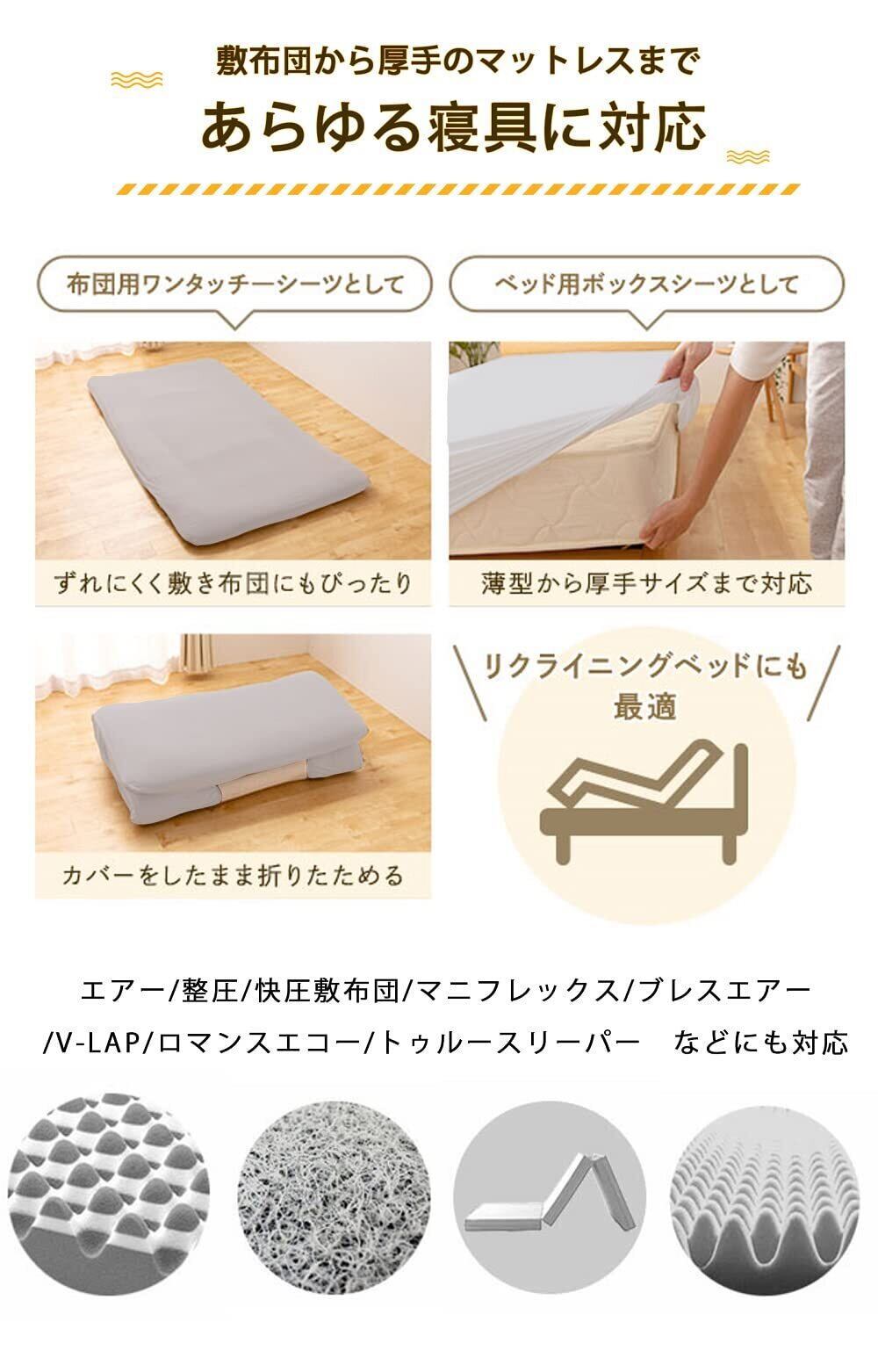 【対応サイズ】170cm~200cm(幅)x180cm~210cm(縦)x35cmまで(マチ)・ワイドクイーン、キング、ワイドキング3人用 対応ボックスタイプのびるシーツ。【本体サイズ】165x180x32cm