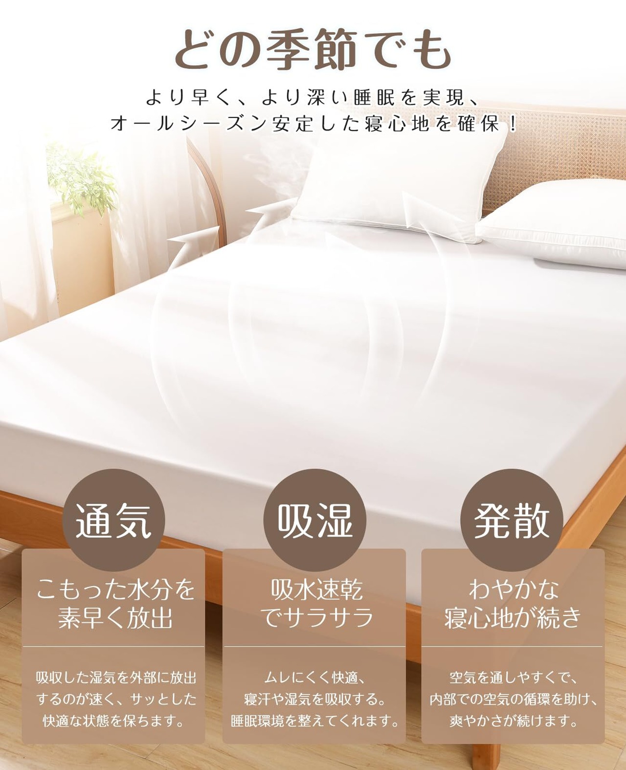 【0秒吸水速乾!30秒で着脱可能】極細糸・高密度な90g平織りで、一般的な織りよりも表面積が広く吸水性に優れた生地なので、汗をかいてもすぐに吸収、爽やかな使い心地です。じめじめベタベタをシャットアウト、汗を多くかく方やお子様にもおすすめです。一人で脱着が簡単なワンタッチのボックスシーツ型デザイン。取り外しも楽なので、お手入れやベッドメイキングの手間が削減できます。起床後にベッドメイキングをし直す手間がかからないのも嬉しいです。