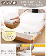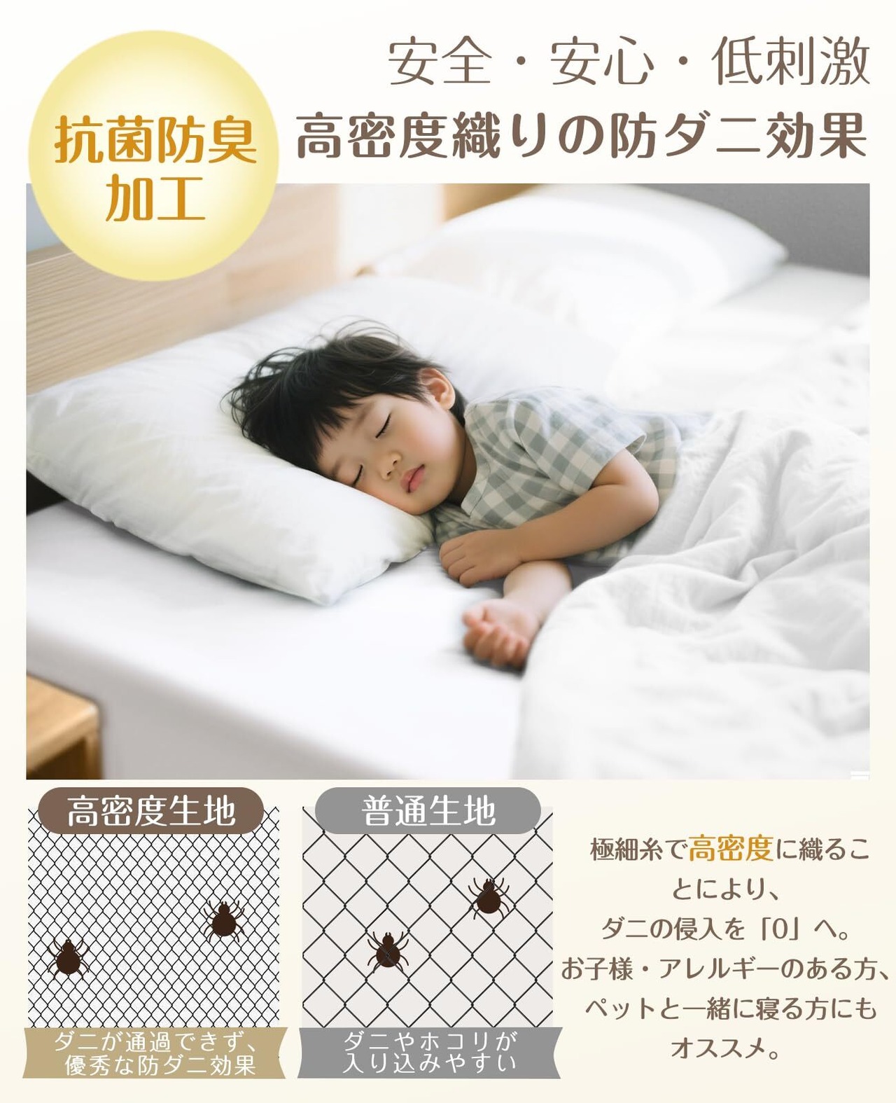 【全方位守る快適!防ダニ抗菌防臭】良質な素材で抗菌防臭加工が施され洗えるので清潔を保てて衛生的です。高密度生地を採用しているのでダニの侵入を確実に阻止することができますよ。全周ゴムでマットレス全体をカバーできるのでサイドからの侵入も防げることはもちろん、ズレる心配もなくてお子様とも安心して寝ることができます。厚さ約5cmから30cmまでのさまざまなマットレスに対応可能、寝返りを打ってもずれにくく、シーツがずれて敷ふとんやマットレスを汚れから守ります。