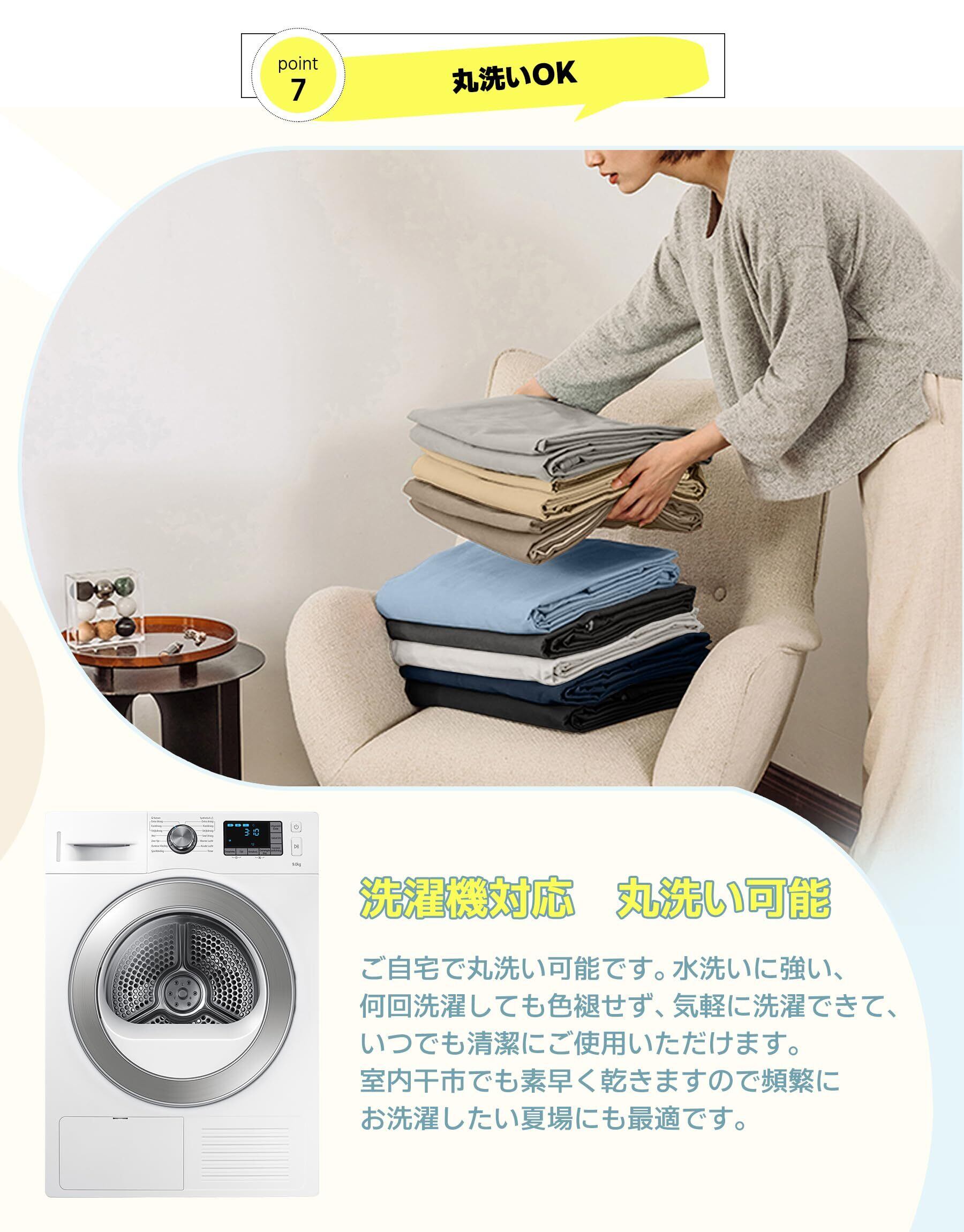 【丸洗いOK】家庭用の洗濯機で洗うことが可能です。手間をかけずに日常の清潔はいつでも簡単にできます。汗をかきやすい季節はもちろん、ペットやお子様に汚されてしまった際にもご安心です。