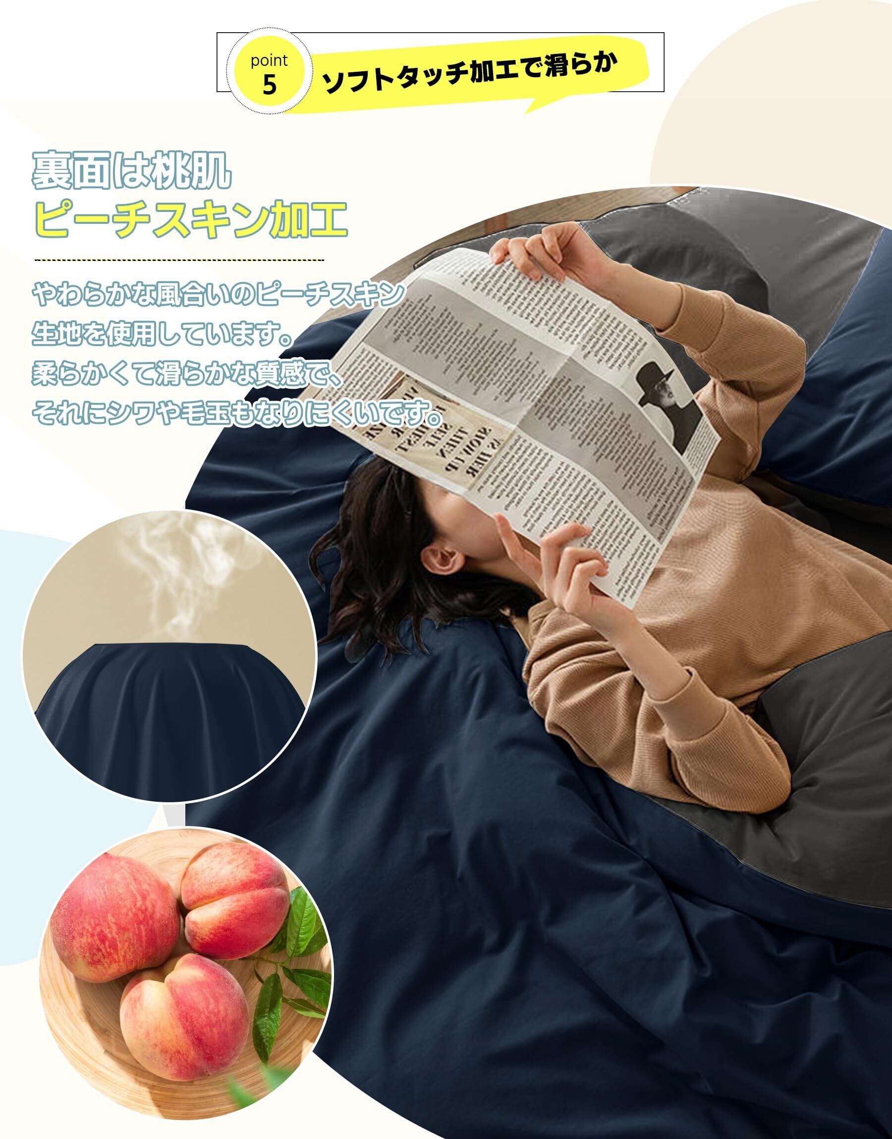 【優しい肌触り】ポリエステル100%のピーチスキン加工生地を使用。シワや起毛が発生しにくい寝具カバーセットです。きめ細やかなピーチスキン加工で柔らかくて肌に優しいから、敏感肌の方でも安心してご利用頂けます。
