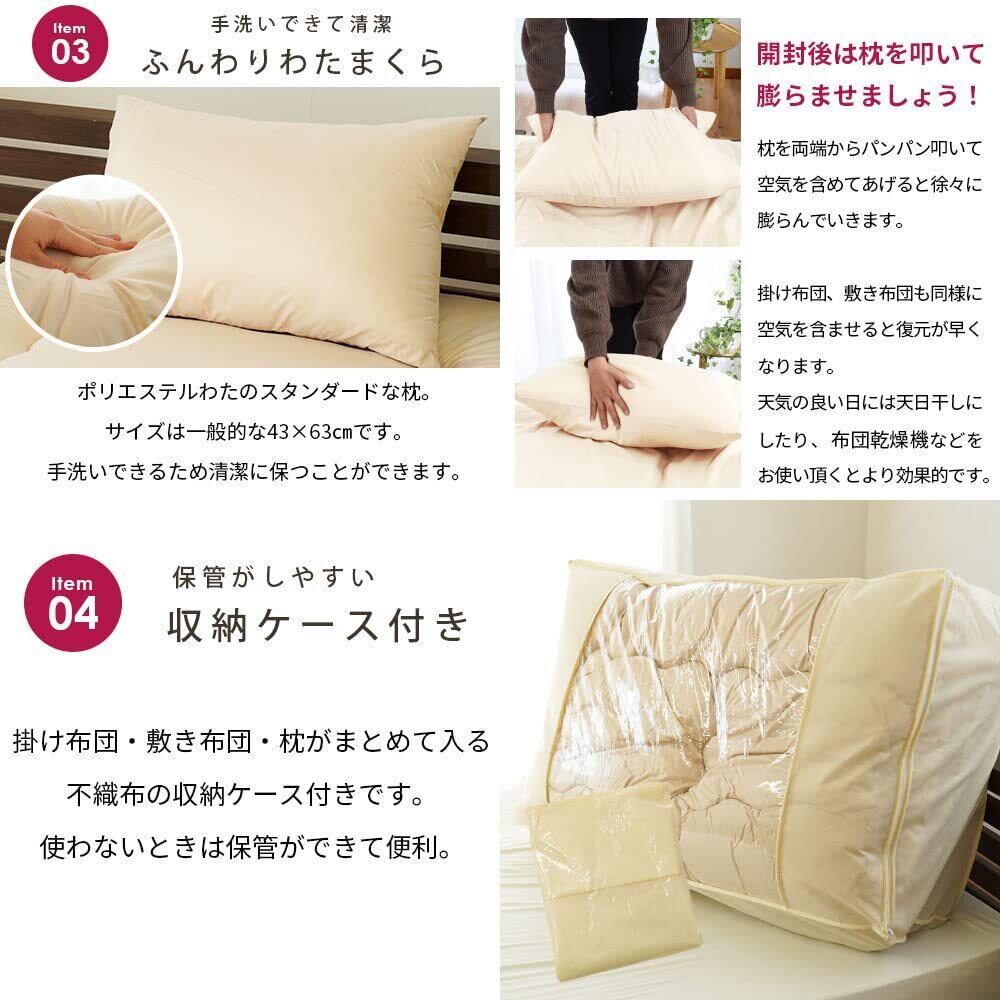 基本の布団3点+選べる布団カバー3点の6点+不織布の収納ケースも付いた7点セット!掛け・敷き・枕すべてホコリの出にくい合繊ポリエステルわた使用!軽くて収納もラクラク。掛布団は中わた1.6kg入り。敷布団は固わたを巻わたでサンドイッチした三層構造。固綿がしっかり2kg入っているため、底付き感を軽減してくれます。カバーはもちろん丸洗いOK!乾きが早くシワになりにくいポリエステル生地を使用しているのでお手入れ簡単 お部屋に合わせやすい人気の無地カラー!