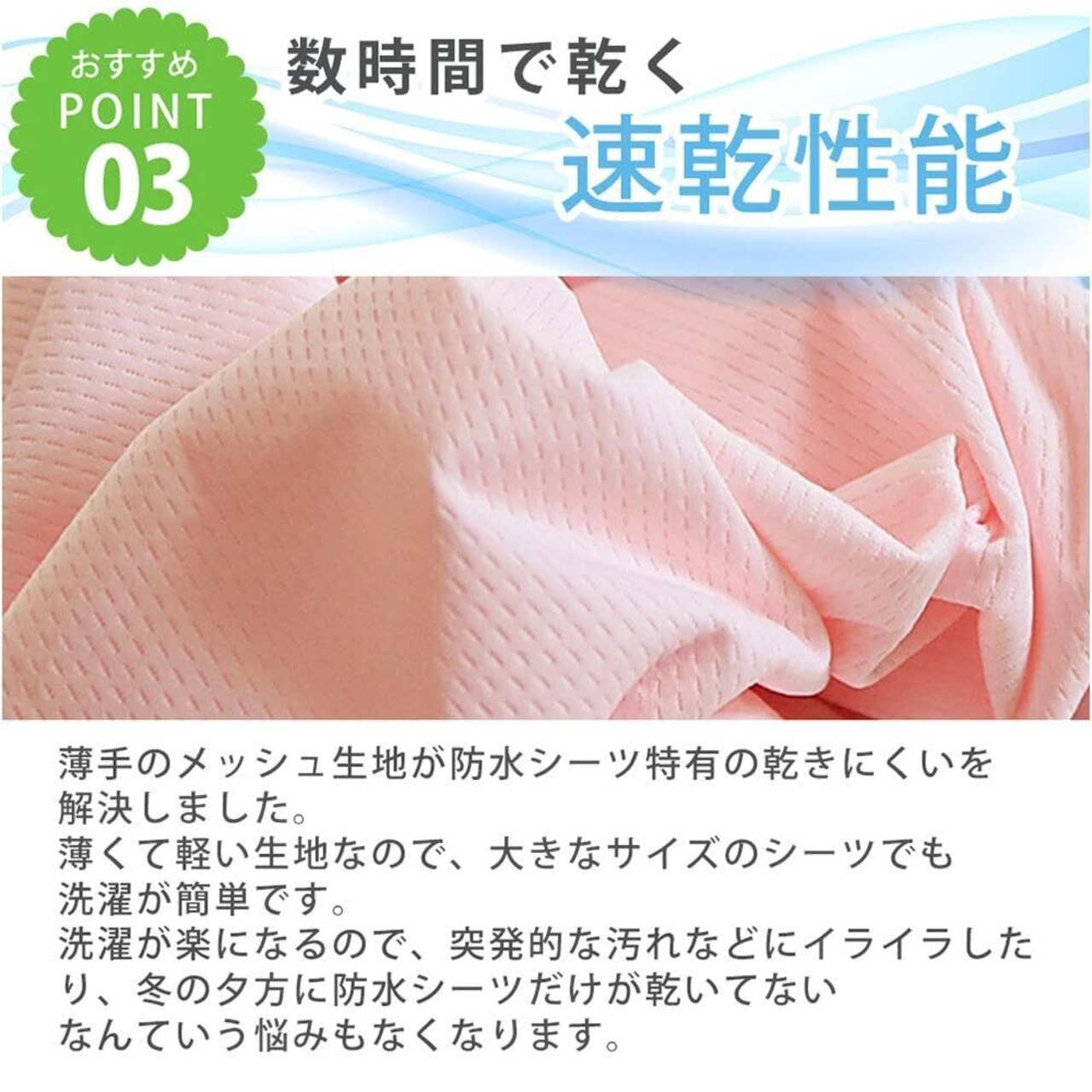 【防水と速乾の両立】お客様のご要望にお応えし、当店の防水シリーズから掛け布団カバーが登場しました!防水シーツは特性上洗濯機で脱水ができないため、乾かすのに時間がかかっていました。そこで、防水面には表地にソフトメッシュ生地、裏地にポリウレタンコーティングを採用することで防水性と速乾性の両立を実現!防水シーツ特有の乾きにくさを解消しました。冬場でも問題なくお洗濯可能です。※表面(メッシュ生地側)を外側にして折りたたんでから洗濯ネットに入れ、単独でお洗濯ください。脱水後、シーツの中に水が溜まっている場合がございますので、取り出す際はバケツなどの容器を使用し、水が溢れないように取り出していただくことをおすすめします。