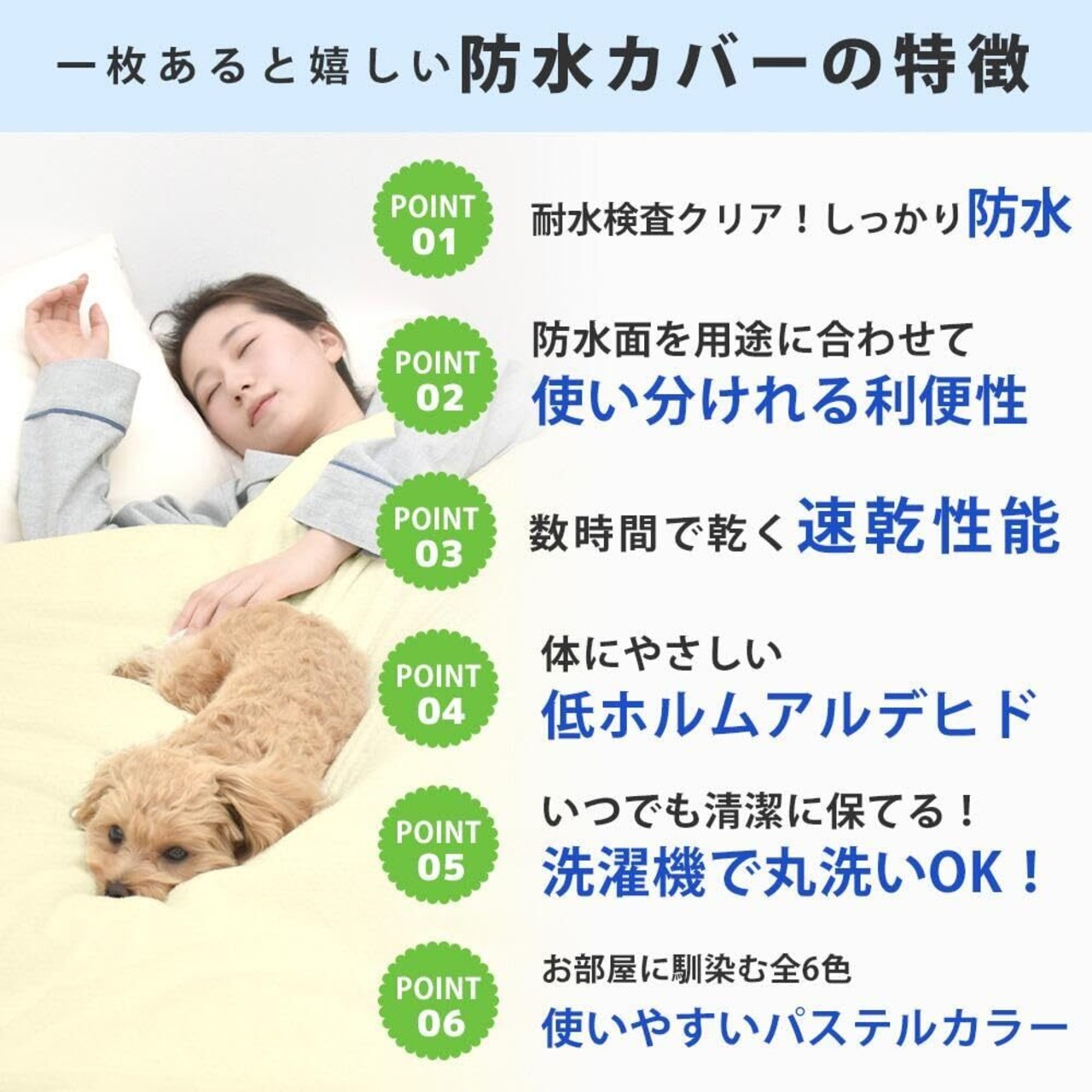 【非防水面は肌触りの良いシャツ地】防水面ではない反対の面には、伸縮性のある綿天竺のシャツ地を採用しました。柔らくて肌触りが良く、吸湿性・通気性も良いので蒸れにくく快適。おねしょ対策には防水面を内向き、布団の上で粗相をしてしまうペットの対策には防水面を外向きにするといった、用途に合わせてご使用いただけます。