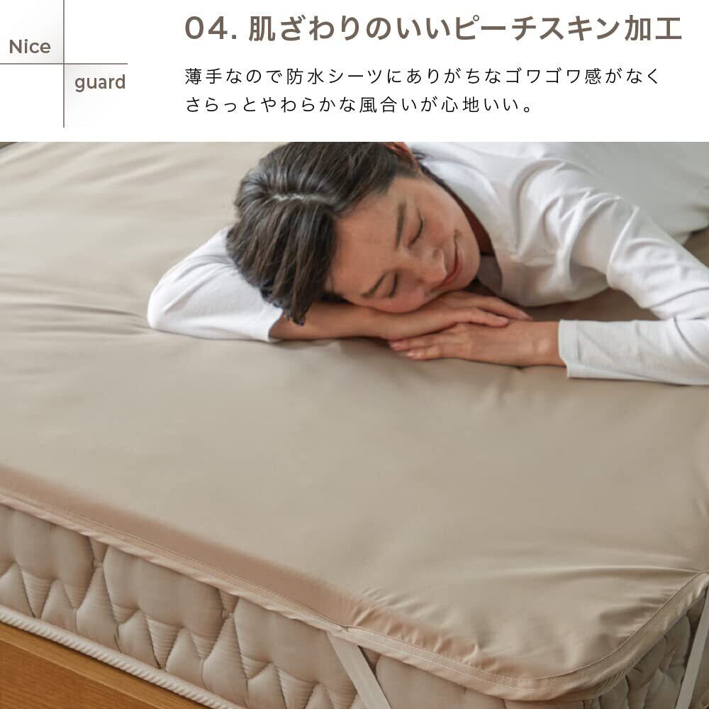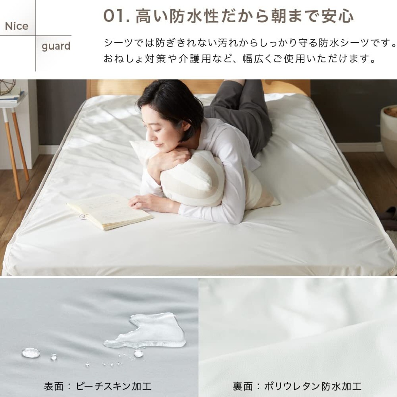 【取返しのつかない不意な汚れから寝具をガード】マットレスや敷布団が汚れてしまって途方に暮れたことはありませんか?カバーをしていても寝汗やおねしょ、血液などの水分は吸収されてしまい、汚れは避けられません。そんな時おすすめなのが、「NICE GUARD+(ナイスガードプラス)しっかり防水シーツ」。リーズナブルながら、洗えない敷布団やマットレスを不意の汚れからしっかり守るフラットシーツタイプの防水シーツです。