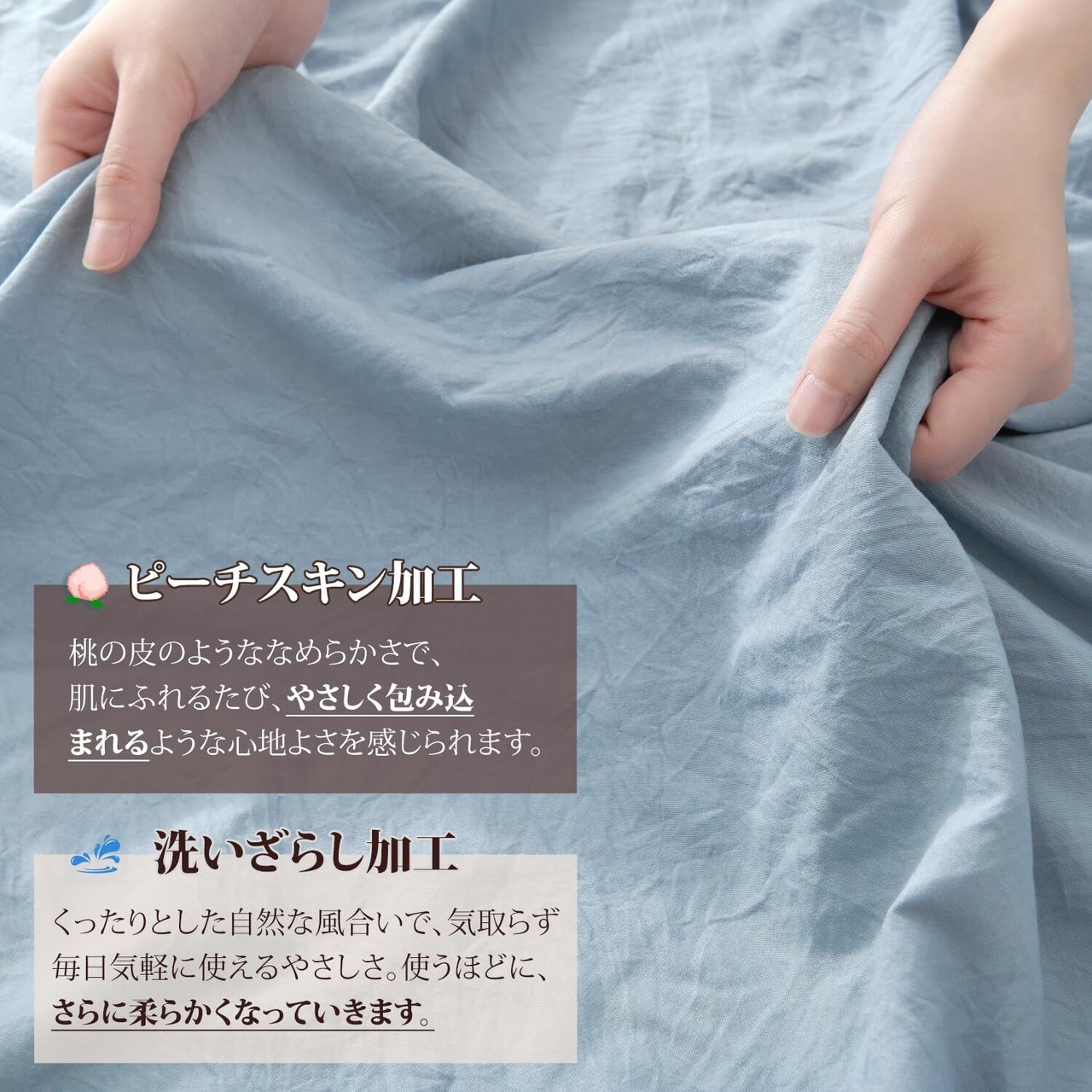 「洗いざらし+ピーチスキン加工」洗いざらし仕上げにより、使い始めからやわらかな風合いを楽しめます。さらに、表面には桃の皮のような微細な起毛(ピーチスキン加工)を施し、ポリエステル素材でありながら天然繊維のようななめらかな肌触りを実現しました。毛玉やほつれができにくく、長く愛用いただけます。