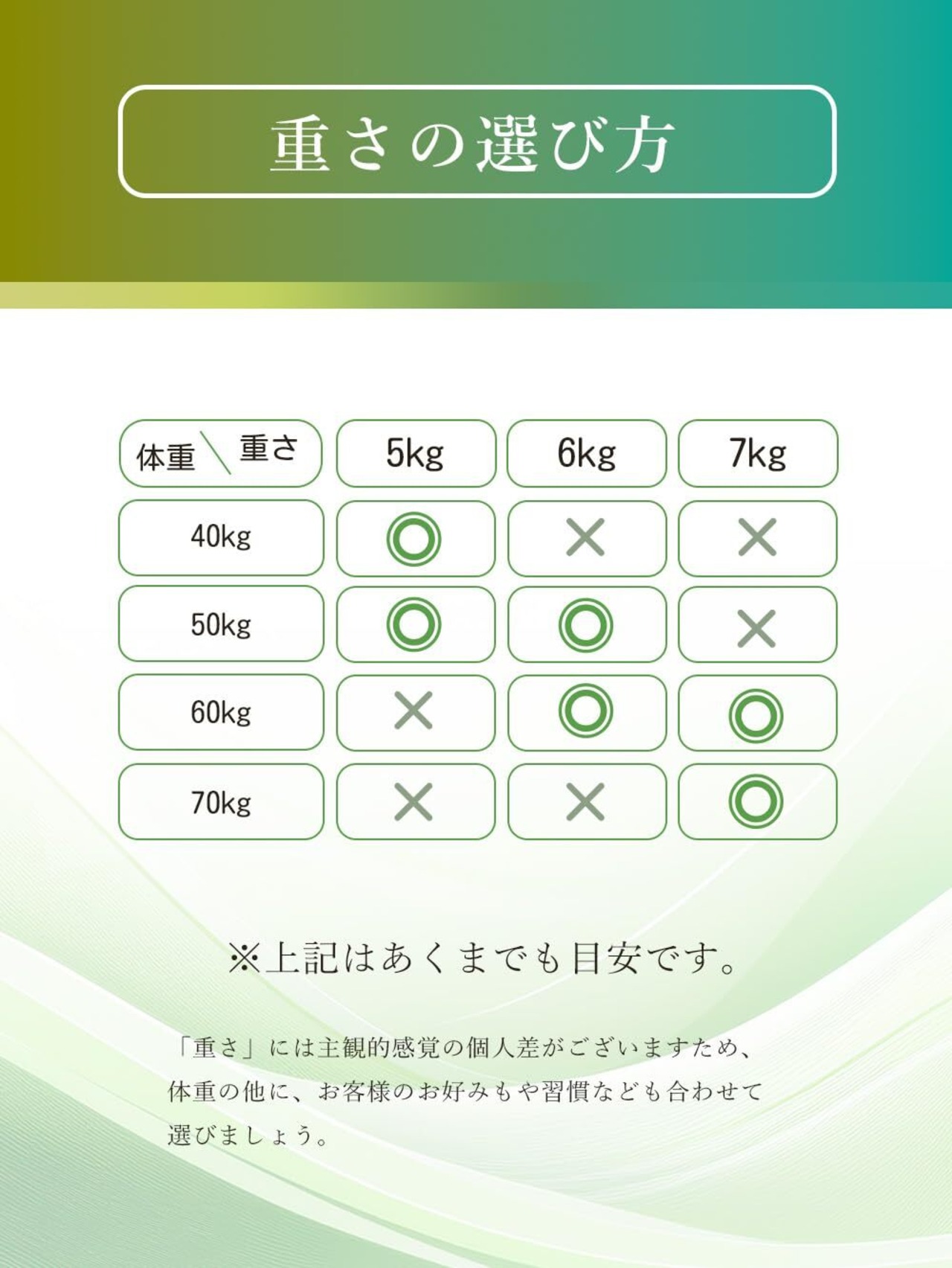 【重さの選び方】加重ブランケットを選ぶ際は、自身の体重の10%に1kgを加えた重さが推奨されます。このウェイトブランケットは5~7kgの3種類の重さがあり、5kg(体重範囲:40kg~50kg)、6kg(体重範囲:50kg~60kg)、7kg(体重範囲:60kg~70kg)。ブランケットサイズ:150×210cm。