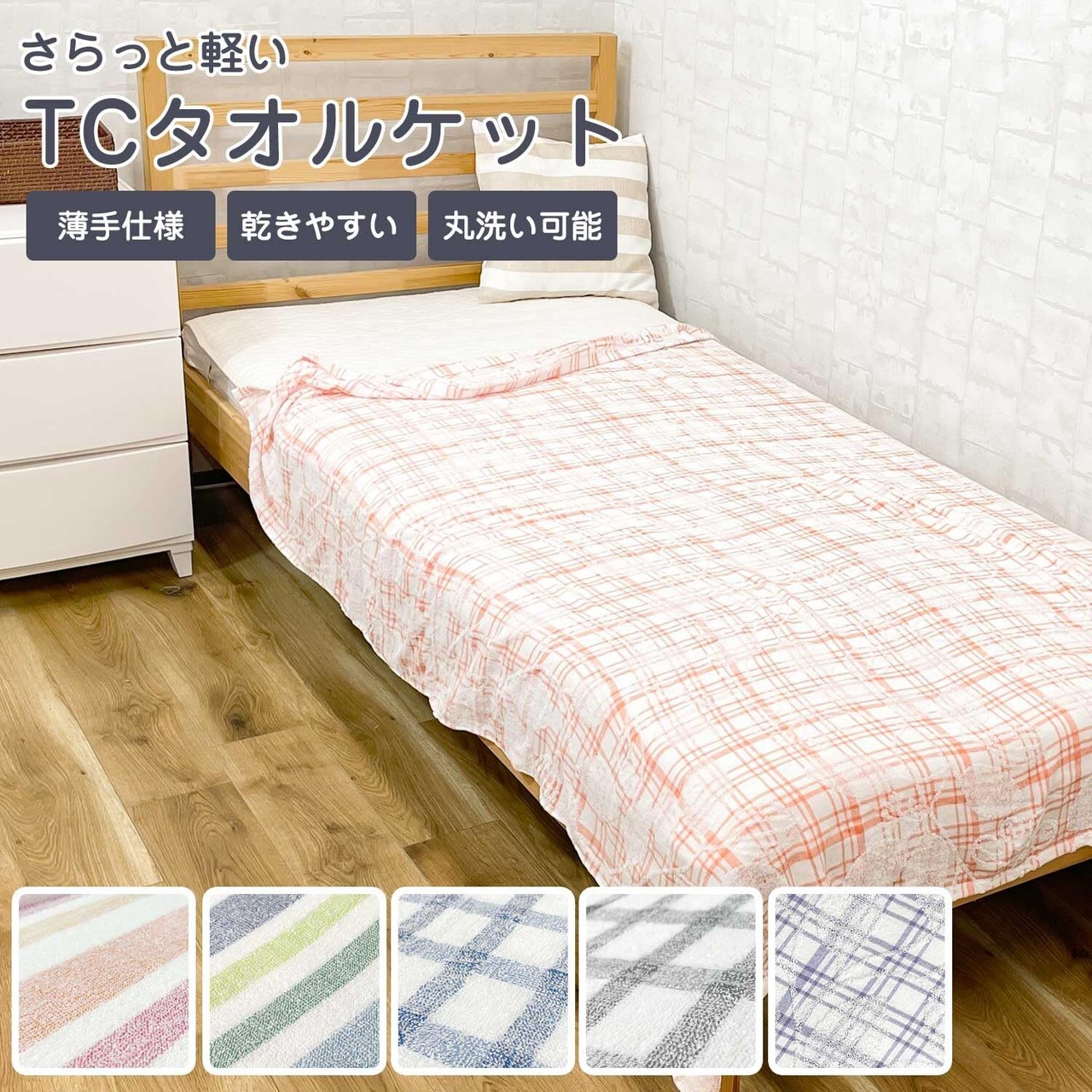 【商品名】TC綿パイルタオルケット 【商品サイズ】約190cm×140cm 【商品重量】約560g 【カラー】花柄パープル 花柄オレンジ ボーダーブルー ボーダーピンク チェックブルー チェックグレー 【素材】パイル部分 綿100% グランド部分 ポリエステル90% 綿10% 【生産地】中国