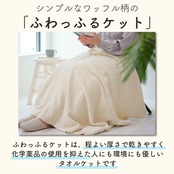 【ふわふわ肌触り】ワッフル柄の生地をふわふわに仕立てた「ふわっふるケット」。栽培からこだわったオーガニックコットンをパイル部分に使用しており、天然素材のタオルケットならではの優しい肌触りが感じられます。