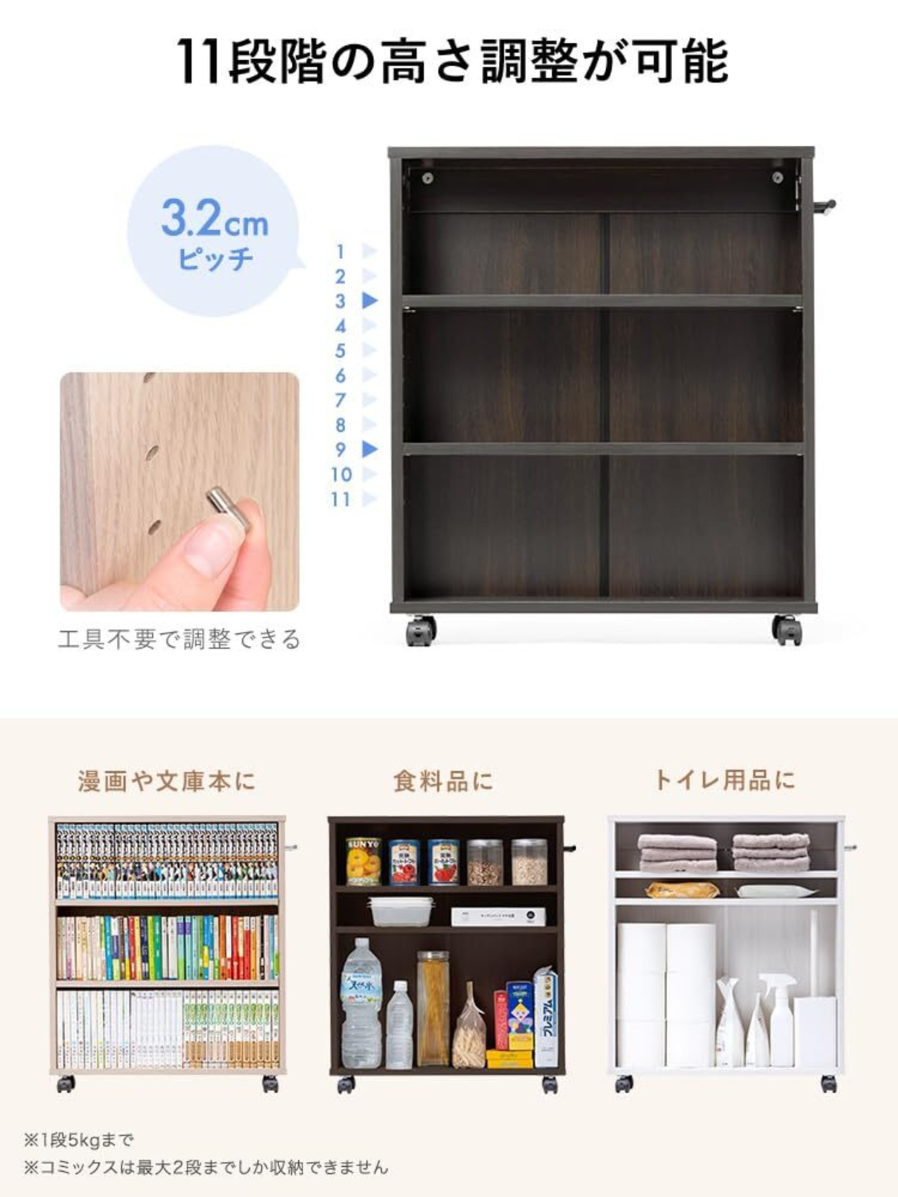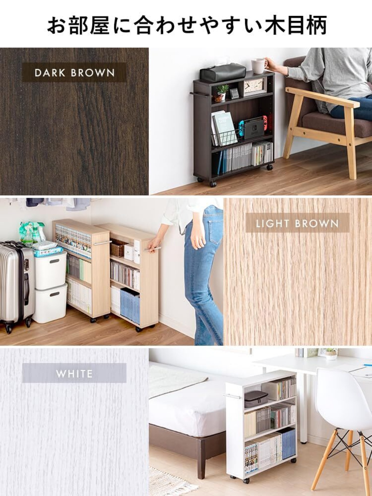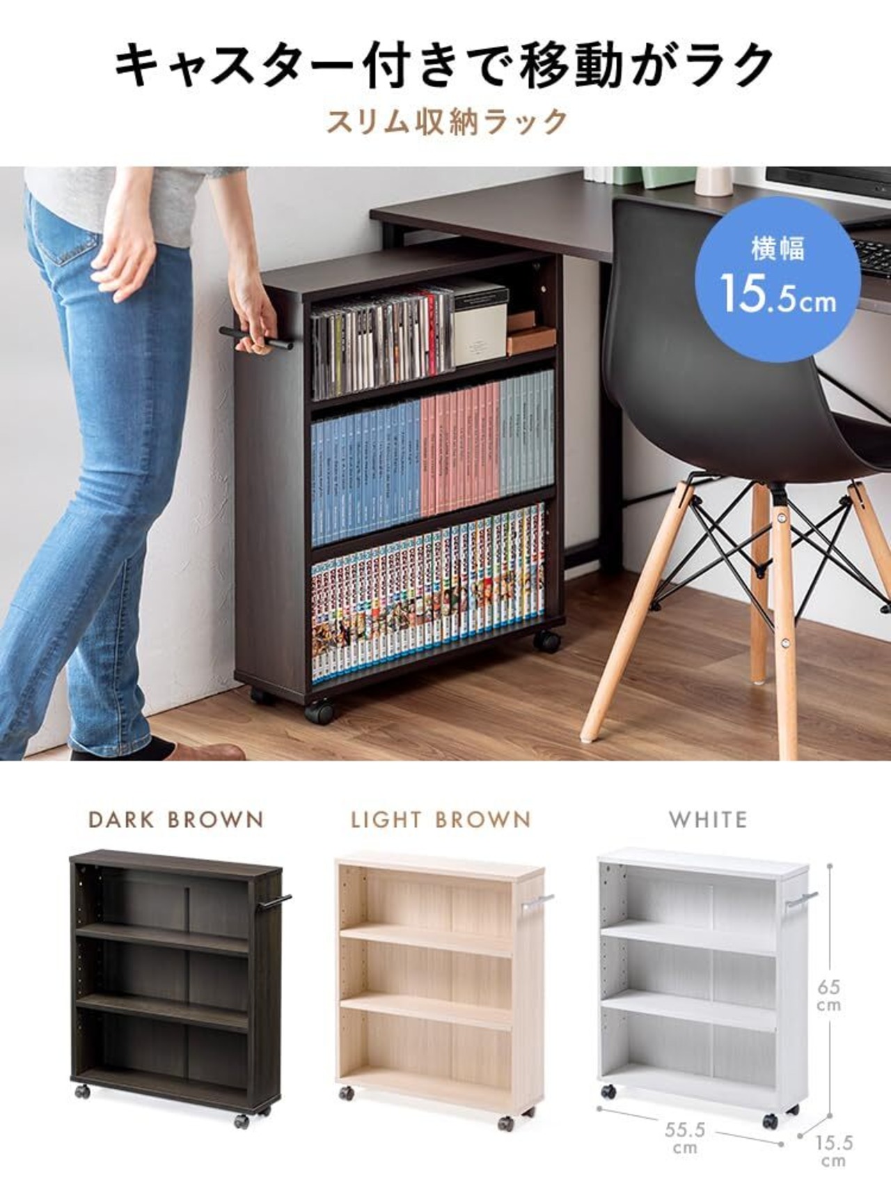 【すき間に収納スペースを!】押し入れやクローゼットにDVDやCD、ゲームソフトなどのメディアやコミックなどを収納することができるキャスター付き収納ラックです。横幅約15.5cmのスリム設計で、押し入れやクローゼットの他にデスク周りやキッチン周りなどの隙間にも収納することができます。