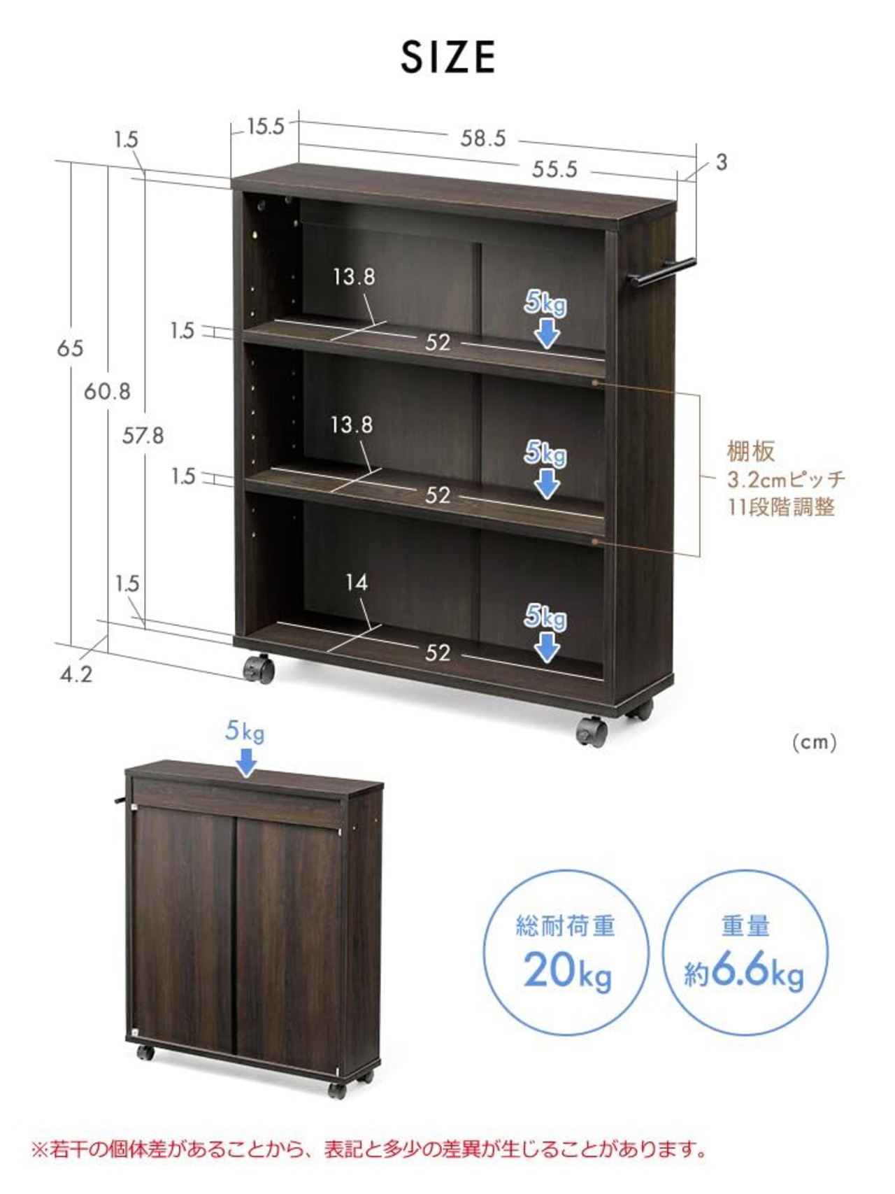 【仕様】カラー:ダークブラウン 製品サイズ:約W555×D155×H650mm(キャスター含む/取っ手含まない) 製品重量:約6.6kg 材質:木製 出荷形態:ノックダウン組立式(お客様組立) 保証期間:初期不良のみ 取扱説明書:日本語取扱説明書あり