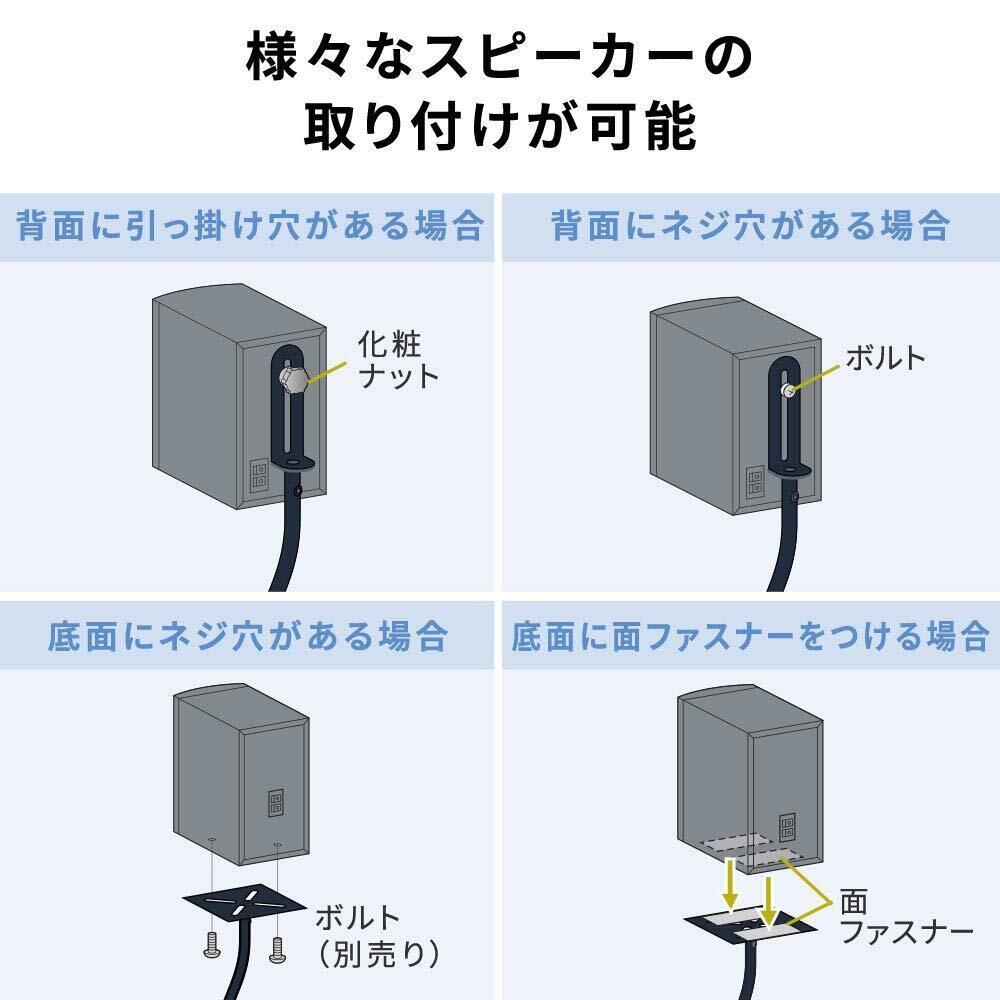 ネジで固定したり、面ファスナーで取り付けたりと、スピーカーに合わせた取り付け方が可能です。ケーブルを通す穴が本体についているので、配線もスッキリします。※コネクタは通せません。