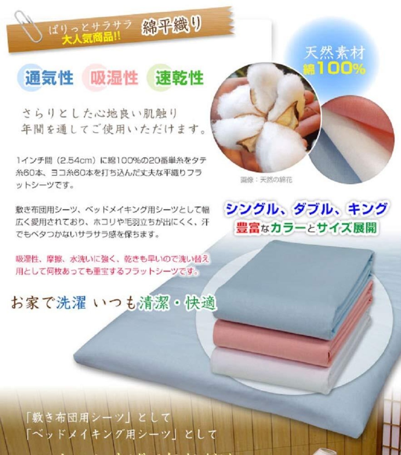 1インチ間(2.54cm)に綿100%の20番単糸をタテ糸60本、ヨコ糸60本を打ち込んだ丈夫な平織りフラットシーツです。色は「ブルー、ピンク、ホワイト」。