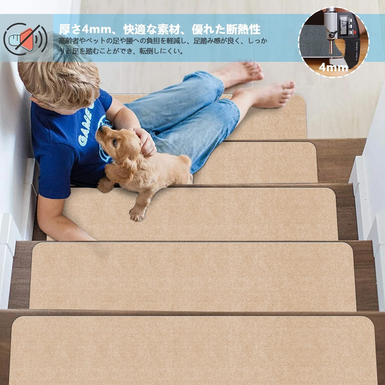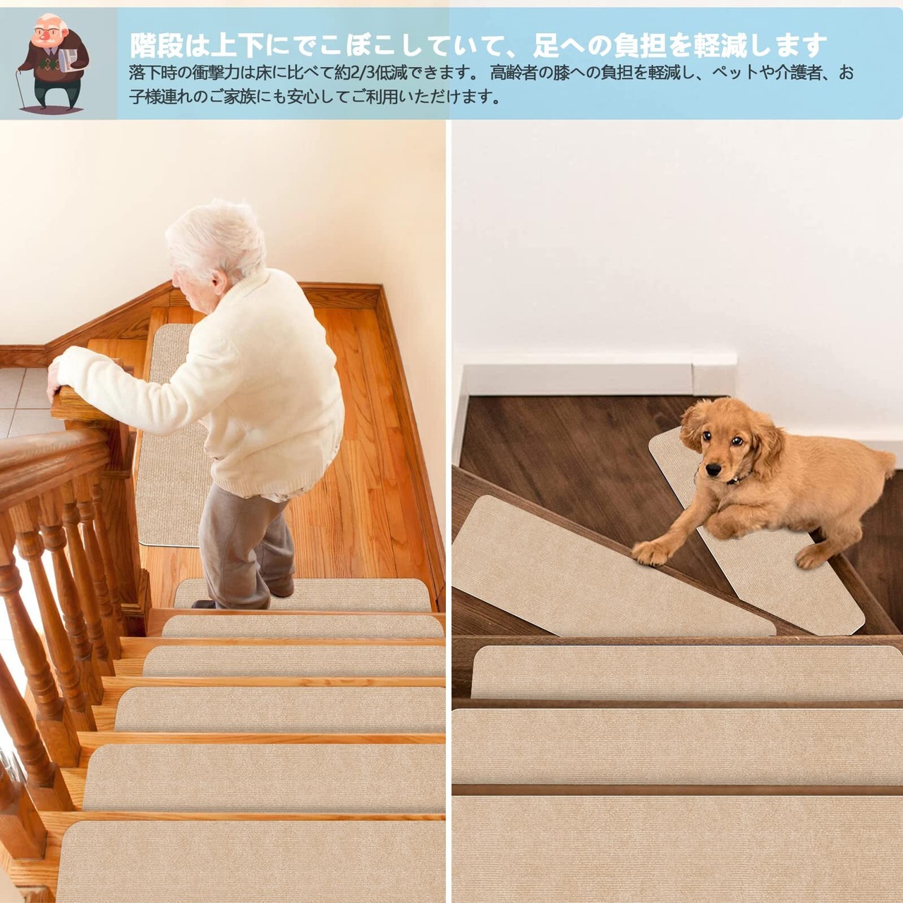 【在庫セール】【 限定ブランド】階段マット 階段用滑り止め70X22cm 【15枚入り】 階段カーペット 吸着マット厚み4mm 階段敷き Bolinker 足腰負担軽減 ズレない 床保護 ステップマット 階段クッション 転倒防止 キズ防止 子供や高齢者 ペットなどの安全対策に 猫犬階段滑り止めマット(ベージュ)