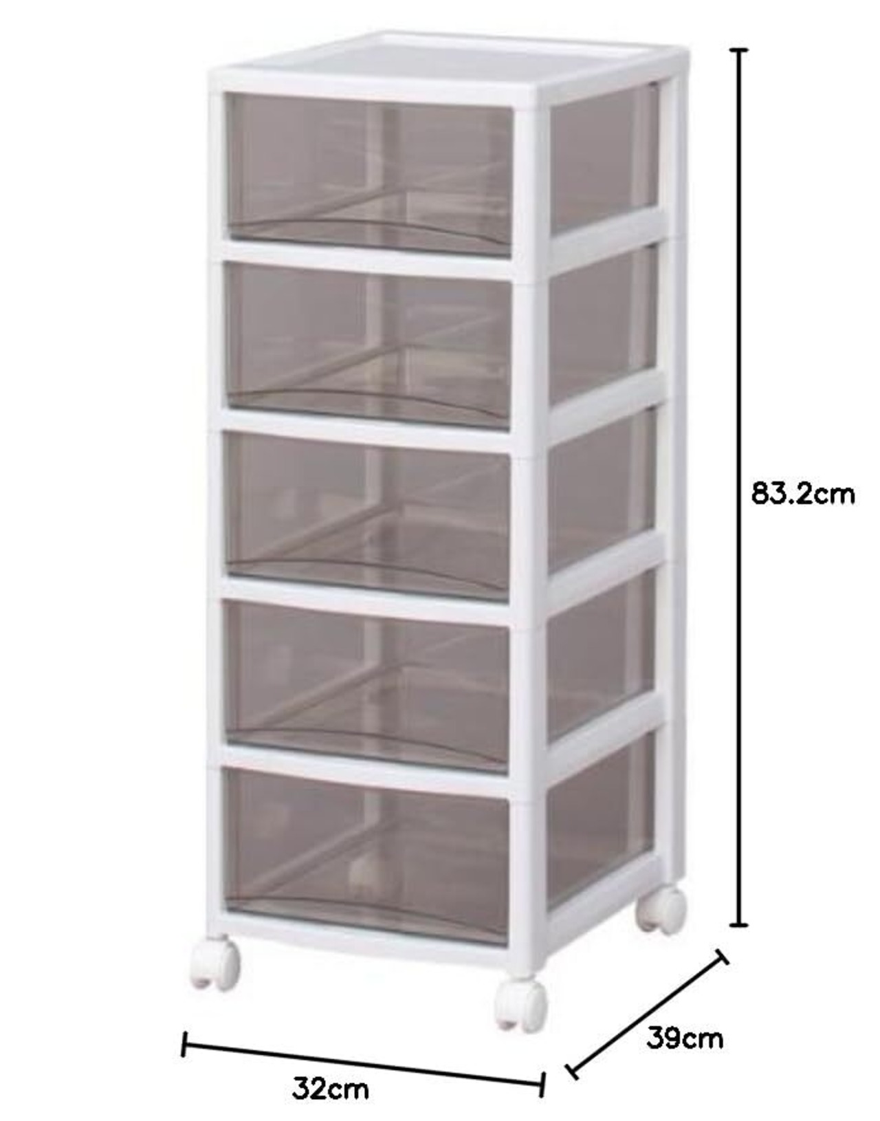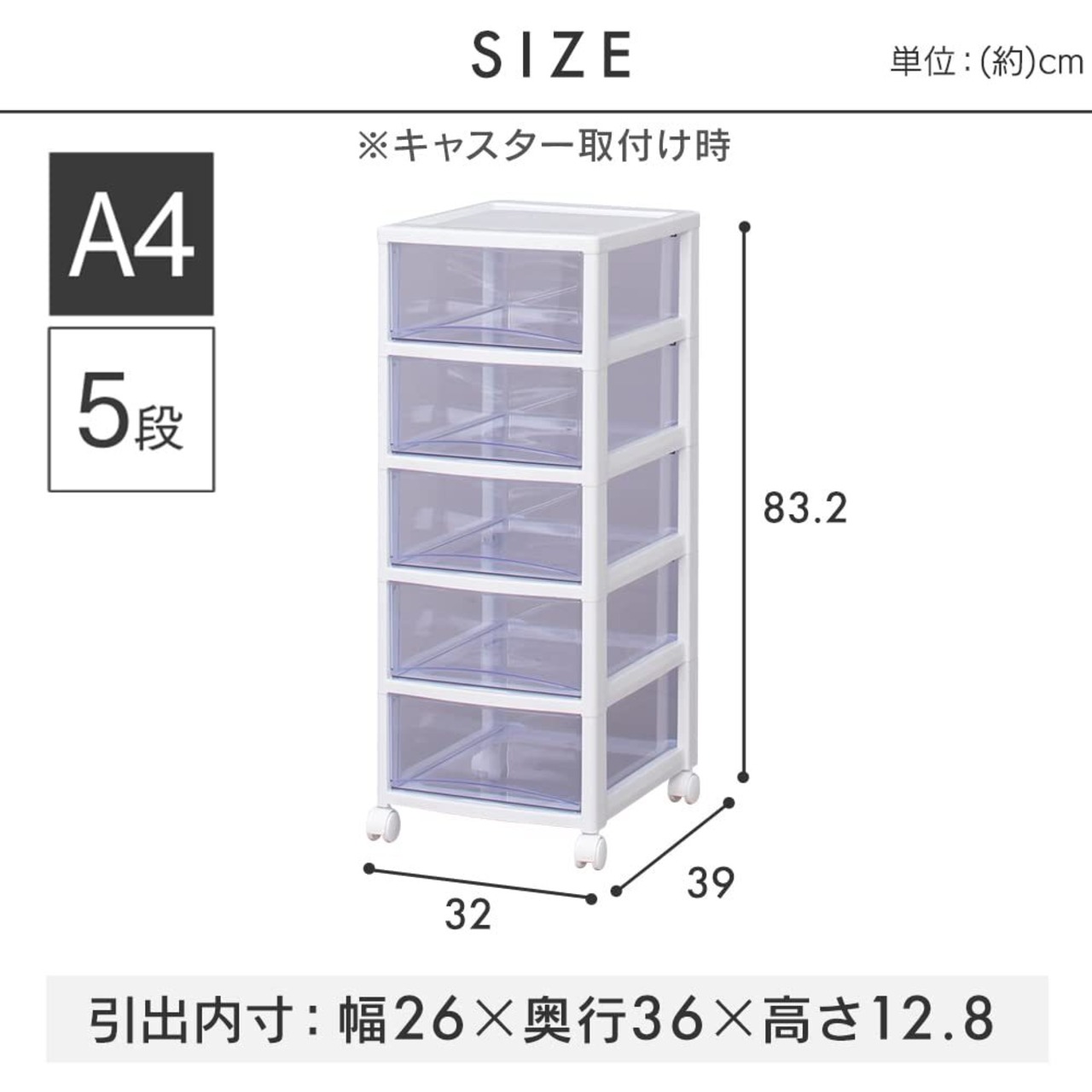 ●引き出しの材質にスチロールを採用しているため透明度が高く、中身が確認しやすいクリアタイプのチェストです。●引き出しは飛び出しにくい、簡易ロック構造です。●移動に便利なキャスター付です