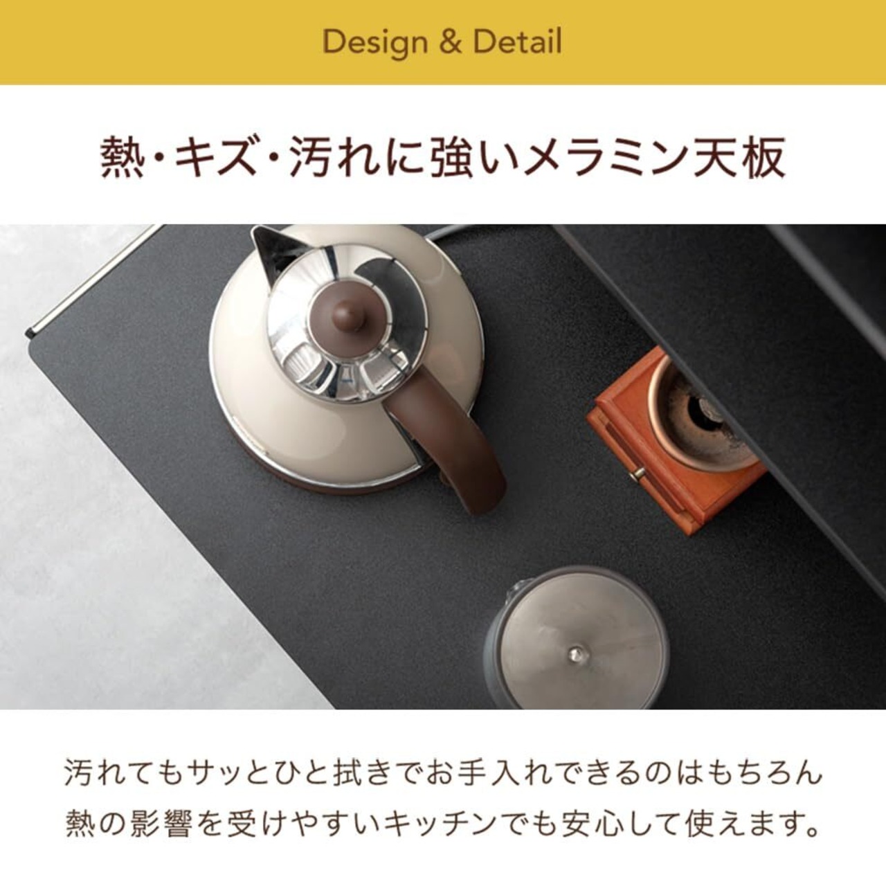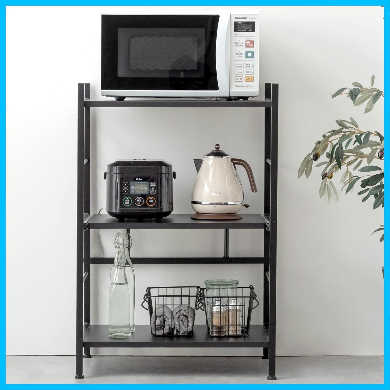 【スタッフのおすすめポイント】・食器や家電をすっきり収納 ・大型レンジも置けるゆったりサイズ ・使い勝手の良いスライド棚 ・長く使える高耐荷重設計 ・熱、キズ、汚れに強いメラミン天板 ・フレームはサビに強い粉体塗装仕上げ