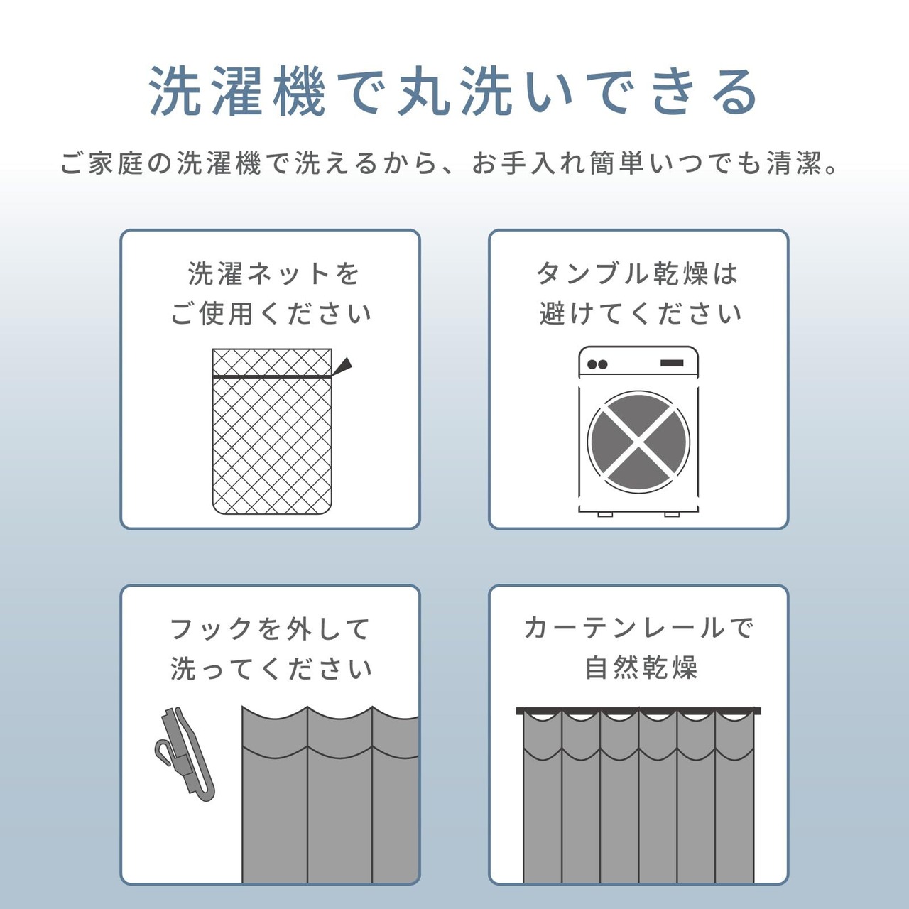 丸洗いで清潔に!毎日開け閉めしているカーテンですが実は意外と汚れています。クリーニングに出さずにおうちで気軽に洗って下さい!