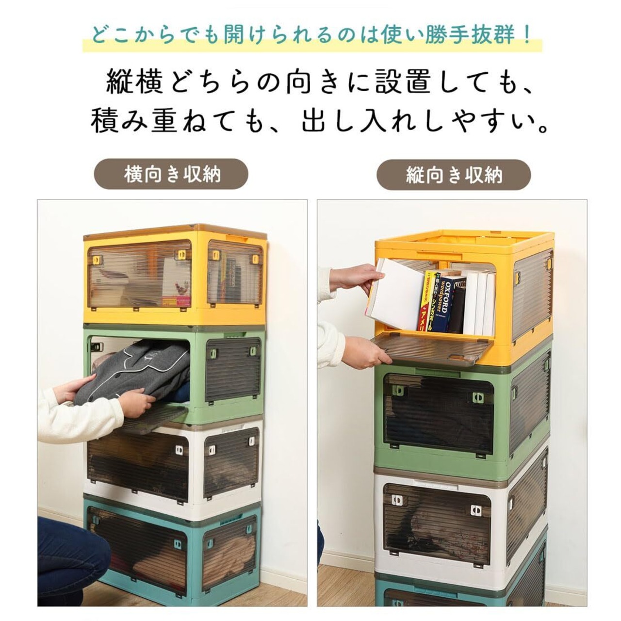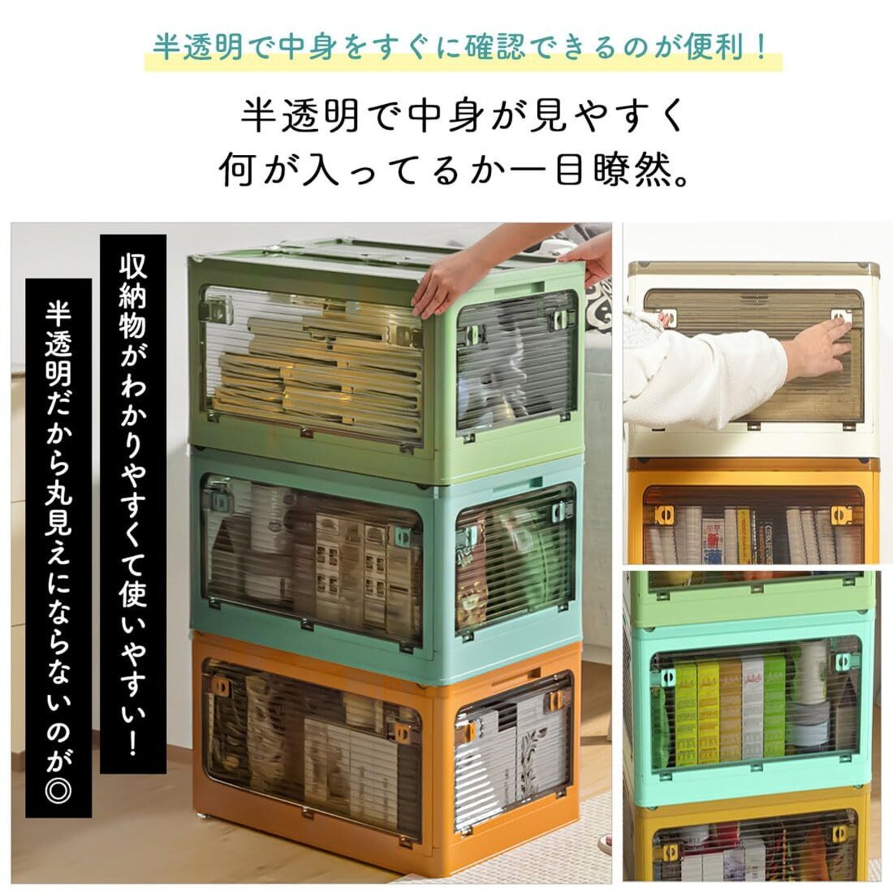 【どこからでも開閉可能&見やすい】縦横どちらの向きに設置しても、積み重ねても出し入れしやすい上下左右5面開閉。半透明で中身が見やすく何が入っているかも一目瞭然〇。蓋とサイドノ扉にロックがついてるのでしっかりと閉じることが可能。